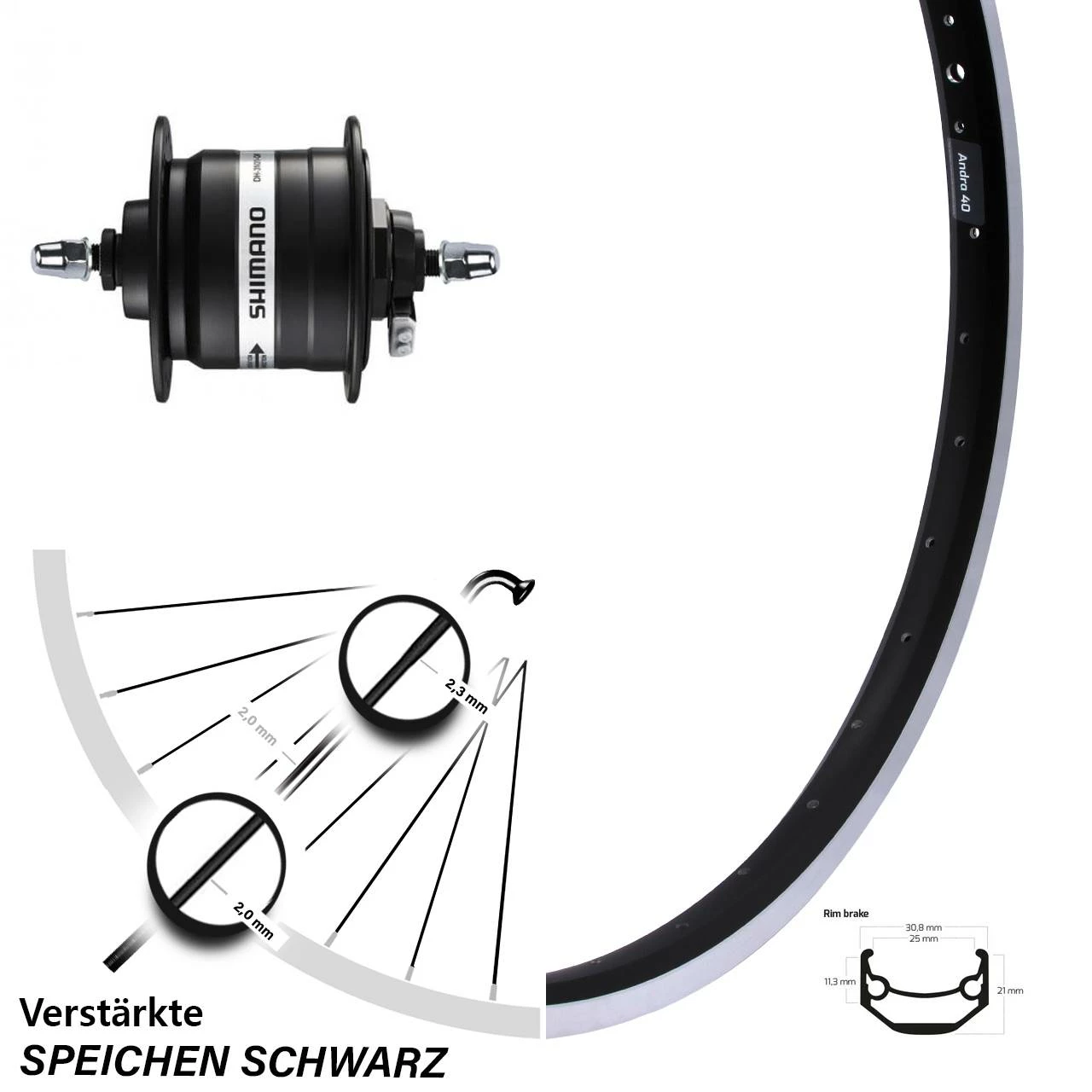 Technische Daten vorderes Laufrad Ryde Andra 40 Felgenbremse schwarz & Nabendynamo Shimano DH-3N31 schwarz Mutterntyp