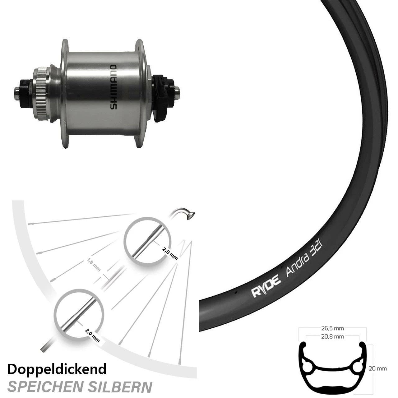 Produktbeschreibung 26 Zoll Disc Vorderrad Ryde Andra 321 mit Shimano Nabendynamo DH-UR700