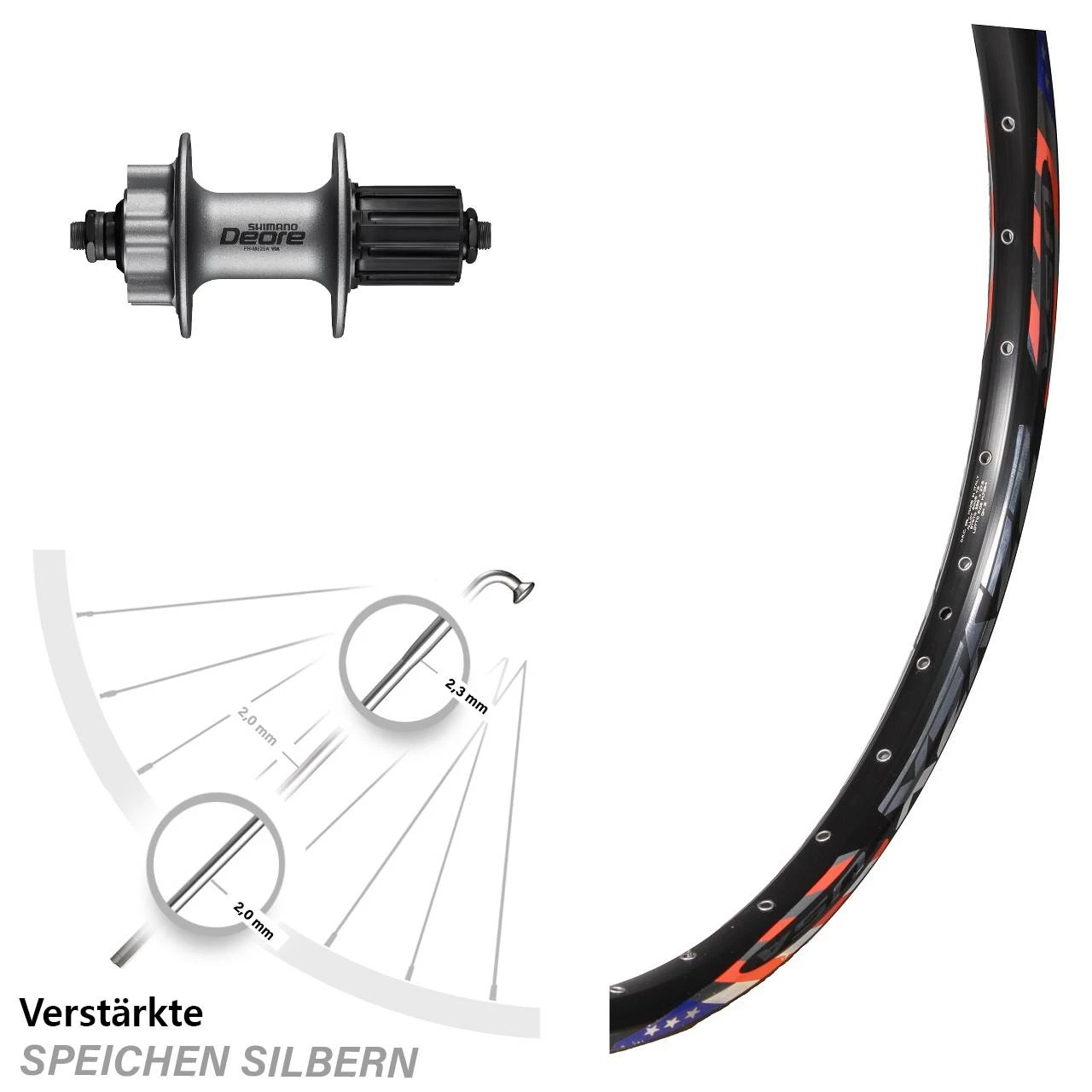 Dieses Hinterrad ist mit verstärkten Speichen, sogenannten Eindickendspeichen (auch ID oder ED genannt) bestückt. Die Speichen sind im empfindlichen und bruchgefährdeten Bogenbereich mit 2,34 mm Querschnitt besonders verstärkt ausgeführt. Die restliche Speiche weist eine Dicke von 2,0 mm auf. Dadurch kann das Laufrad insgesamt höher belastet werden, sei es durch schwere Fahrer oder mit viel Gepäck.