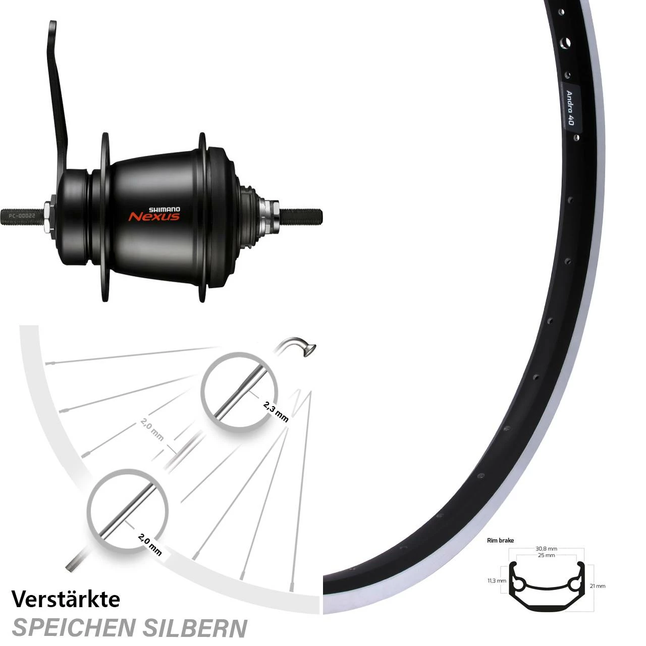 - 36 silberne Sapim Speichen mit Speichenstärke 2,34/2,0 mm Edelstahl verstärkt – besonders stabile und verstärkte Dickendspeiche mit 2,34 mm Durchmesser im kritischen Bereich der Nabe