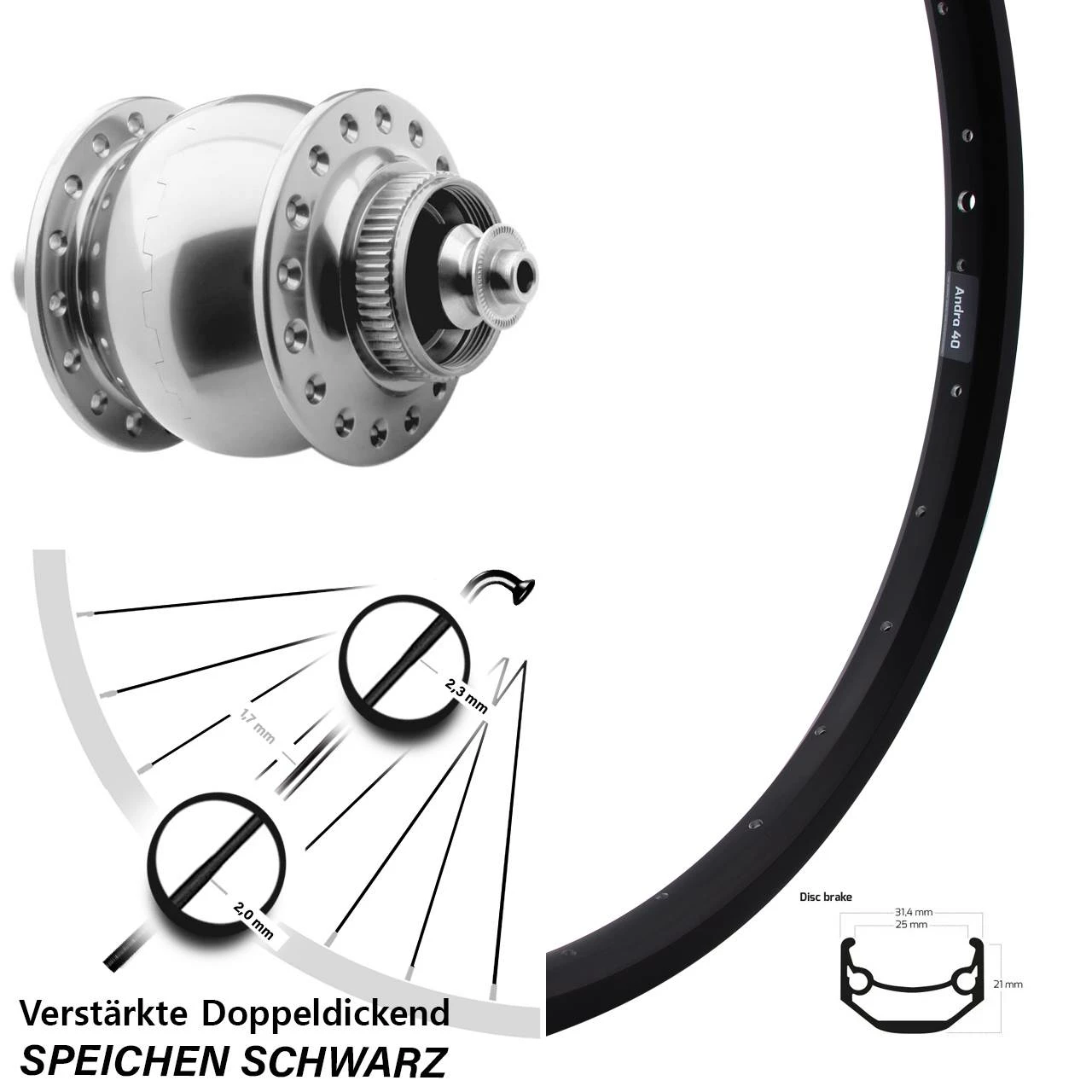 Technische Daten Vorderrad Ryde Andra 40 Disc schwarz & Nabendynamo SON 28 Disc Centerlock Hohlachse silbern eloxiert