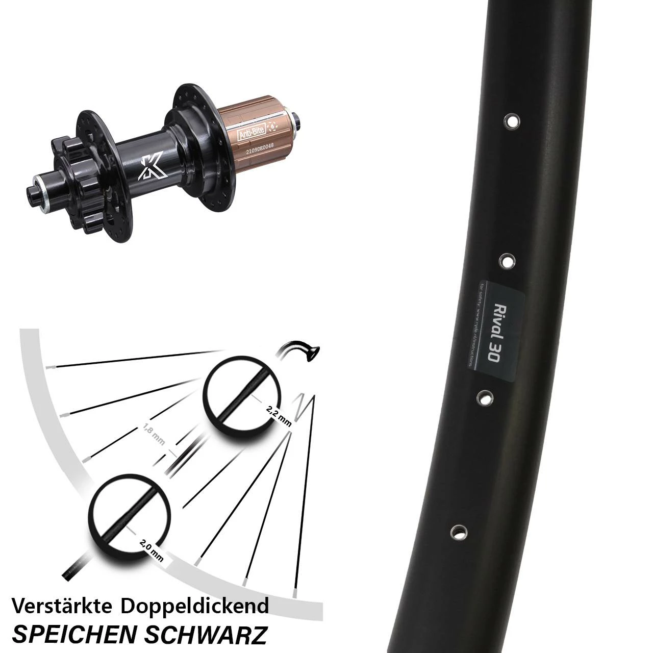 Das robuste 27,5 Zoll, 27,5+ Zoll Hinterrad hat 32 Speichen und bringt Sie auf Fahrrädern mit 6-Loch Scheibenbremsen sicher und bequem voran. Auf ausphaltierten Straßen ,wie auch im Gelände bei unbefestigten Streckenverhältnissen bietet Ihnen das Hinterrad einen festen Halt. Neben einer schwarzen KX-M Hinterradnabe 5/135 6-Loch 11-fach Nabe ist eine stabile schwarze Ryde Rival 30 Disc schwarz Felge in das Vorderrad verbaut. Die ETRTO Größe beträgt 30-584 mm, die Einbaubreite liegt bei 135 mm und das zugelassene Systemgewicht ist auf bis zu 150 kg ausgelegt. Das Hinterrad kann optimal an Fahrrädern mit Kettenschaltungen im Mountainbike / MTB Bereich verwendet werden!