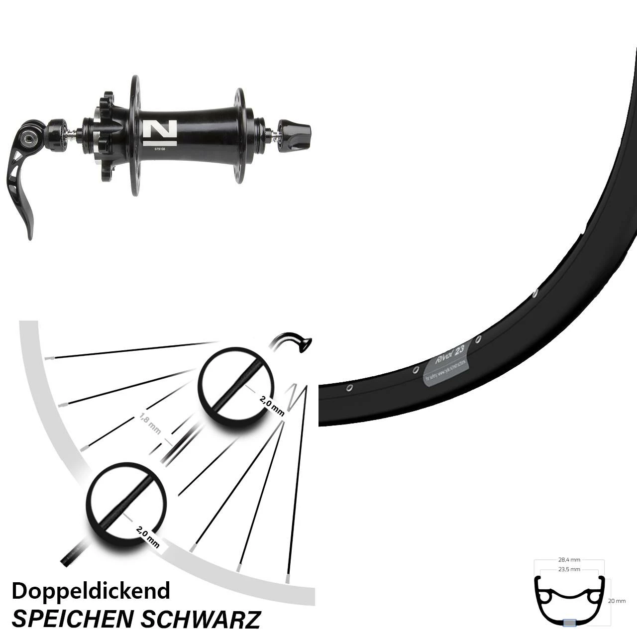 - 32 schwarze Sapim Speichen mit SpeichenstĂ€rke 2,0-1,8-2,0 mm Edelstahl – stabile und gewichtsoptimierte Doppeldickspeiche mit 1,8 mm im Mittelteil und 2,0 mm an den Endbereichen