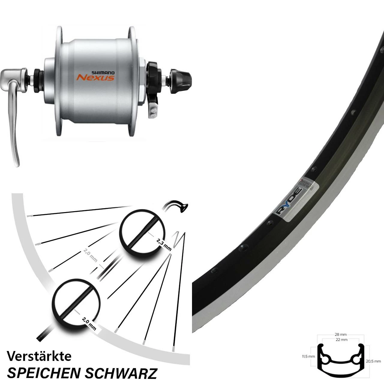 - Vorderrad 27,5 Zoll Ryde Andra 35 schwarz mit Nabendynamo Shimano Nexus DH-C3000-3N silbern