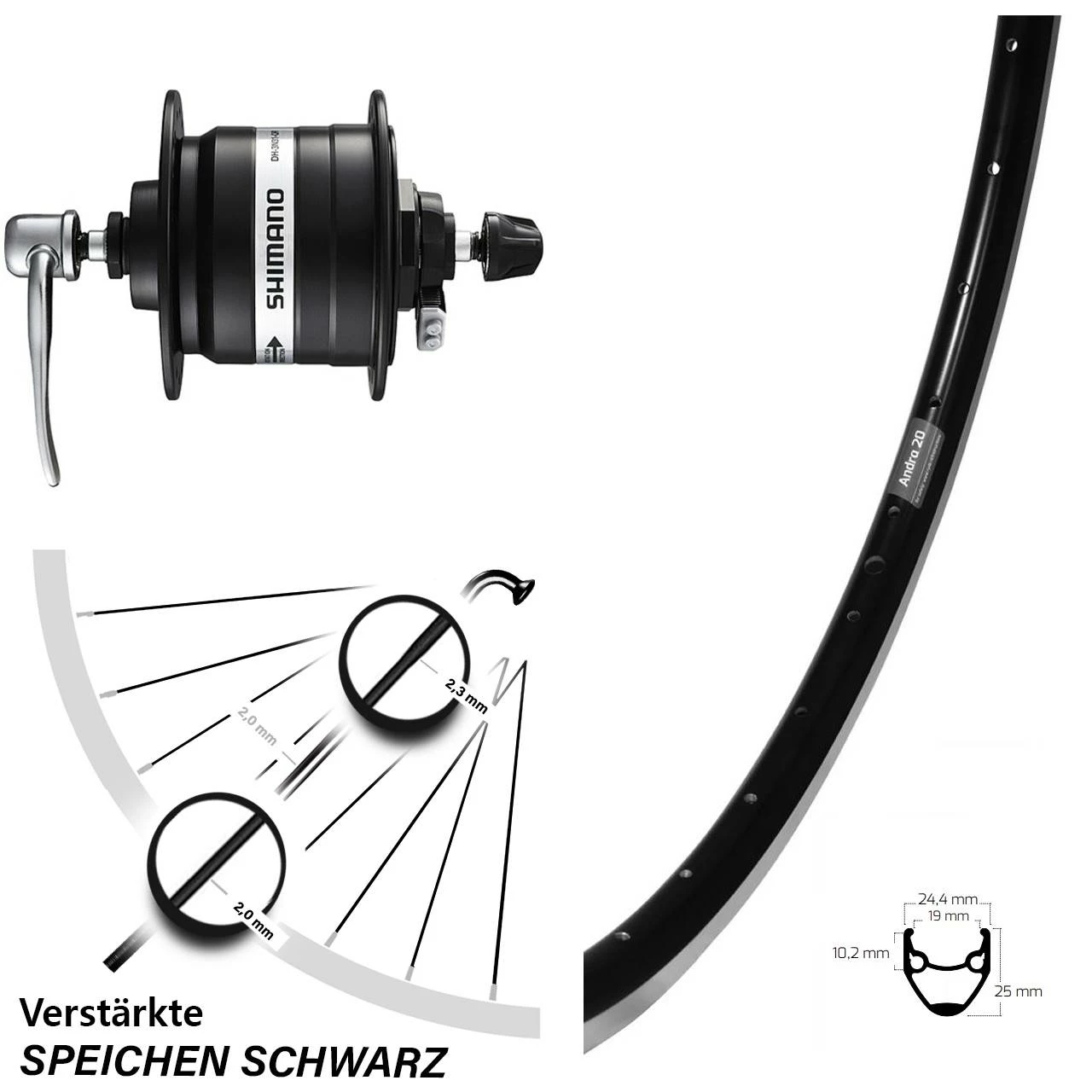 Technische Daten vorderes Laufrad Ryde Andra 20 Felgenbremse schwarz & Nabendynamo Shimano DH-3N31-QR schwarz