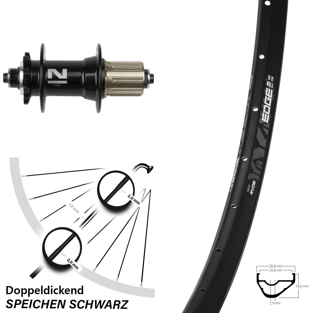 Technische Daten Hinterrad Ryde Edge M22 OS Disc schwarz und Nabe Novatec D042SB schwarz