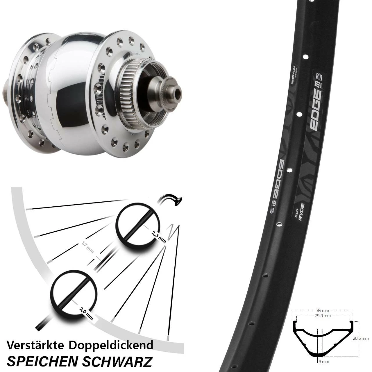 Technische Daten Vorderrad Ryde Edge M30 OS Disc schwarz & Nabendynamo SON 28 Disc Centerlock Hohlachse silbern poliert