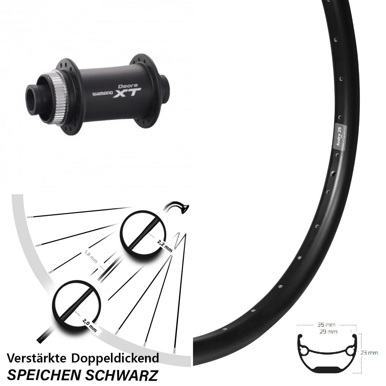 Technische Daten Vorderrad Ryde Andra 29 Disc schwarz mit Nabe Shimano XT HB-M778