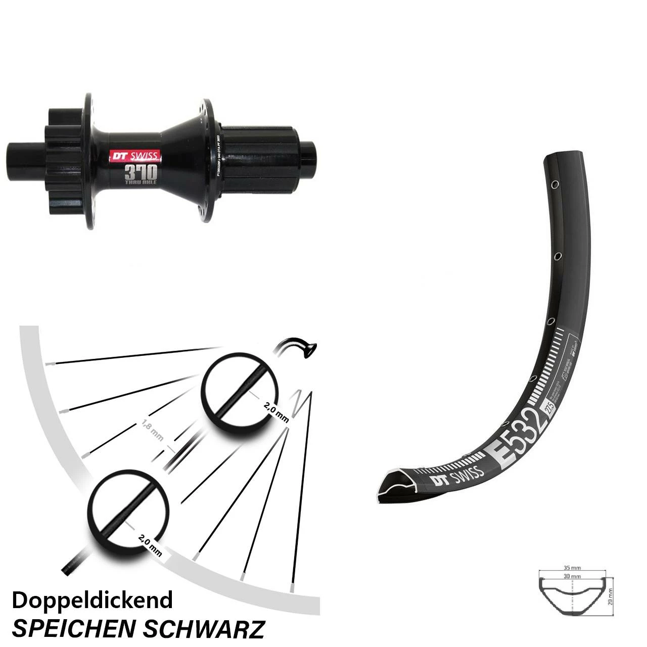 Technische Daten Hinterrad DT Swiss E 532 Disc schwarz und Nabe DT Swiss 370 Disc 6-Loch Shimano 12/142