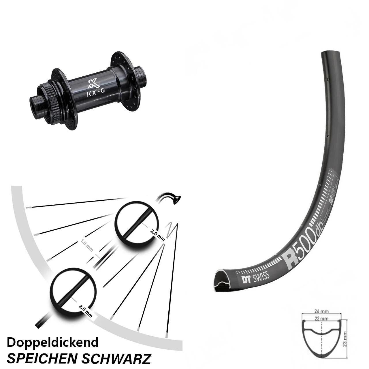 Technische Daten Vorderrad DT Swiss R 500 DB Disc schwarz mit Nabe KX-G Vorderradnabe 15/100 Centerlock
