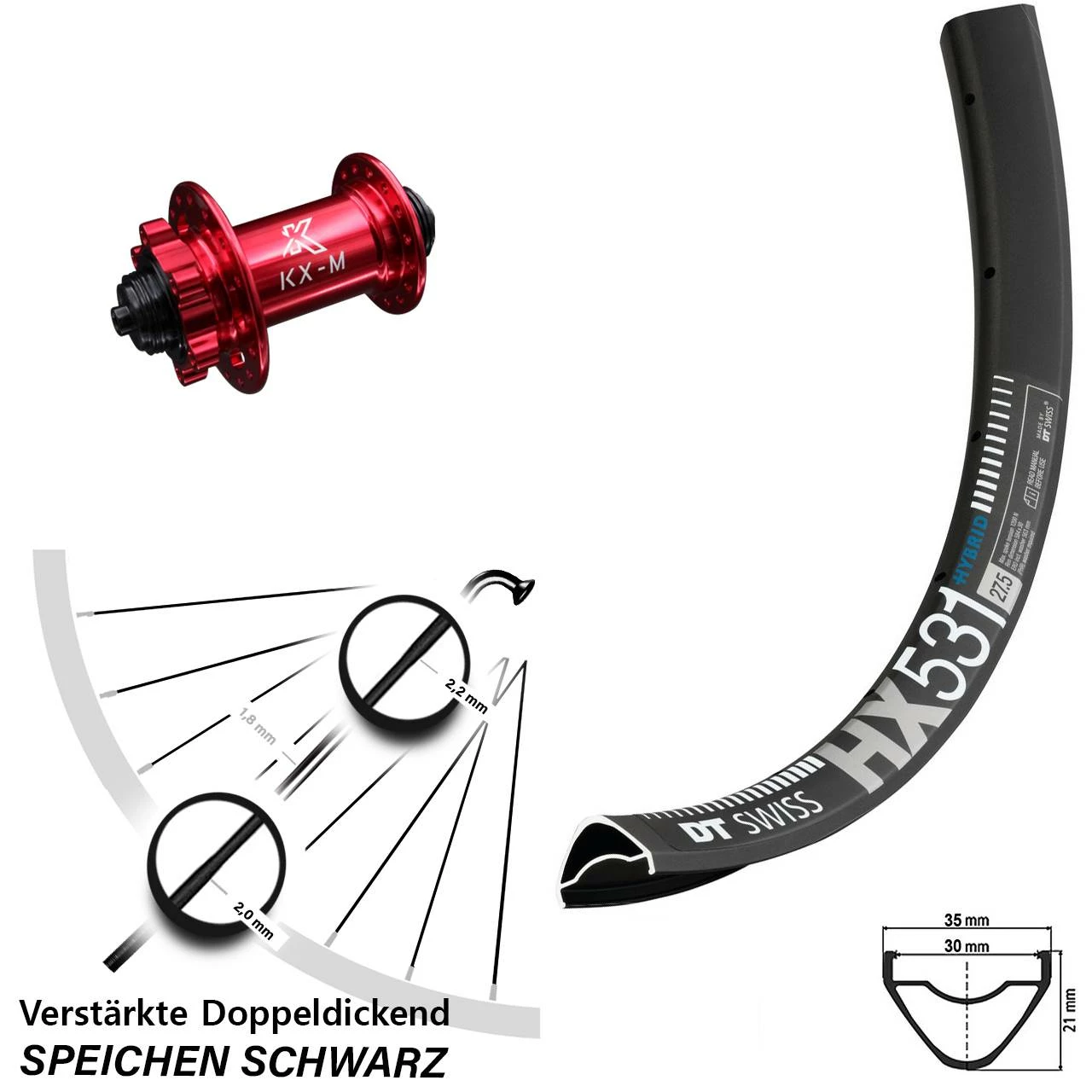 Produktbeschreibung 27,5 Zoll Vorderrad KX-M Nabe rot-eloxiert 5×100 mm DT Swiss HX 531 für 6-Loch