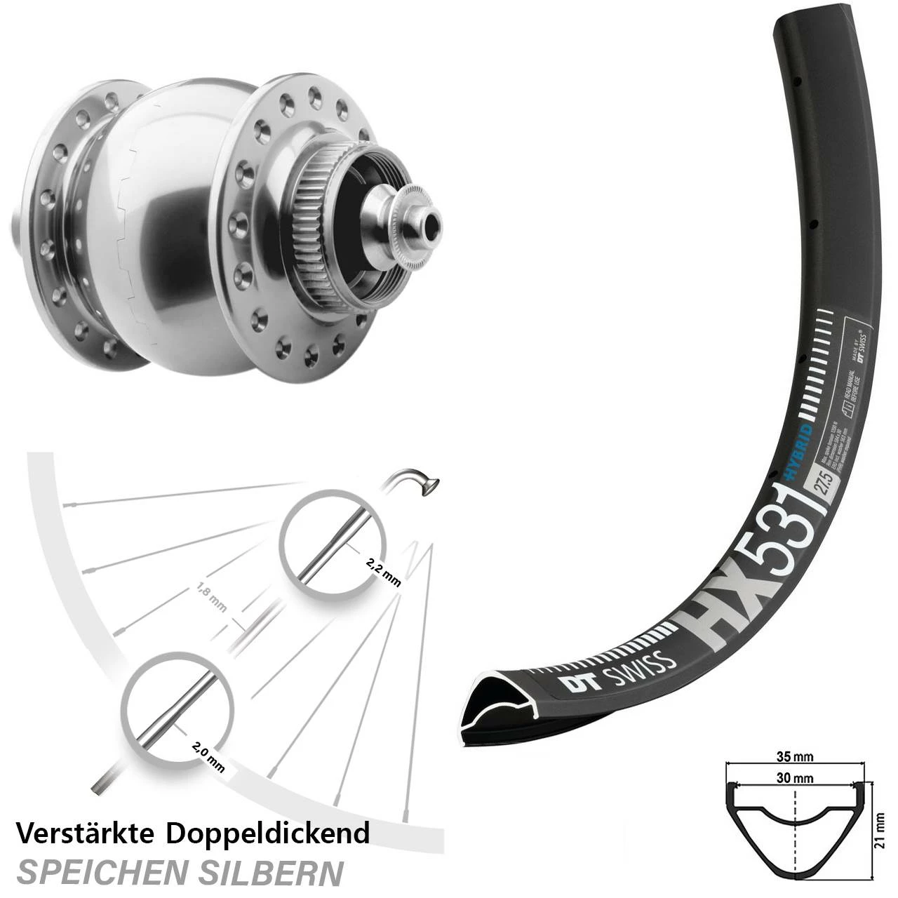 - Vorderrad 27,5 Zoll, 27,5+ Zoll DT Swiss HX 531 schwarz mit Nabendynamo SON 28 Disc Centerlock Hohlachse silbern eloxiert silbern