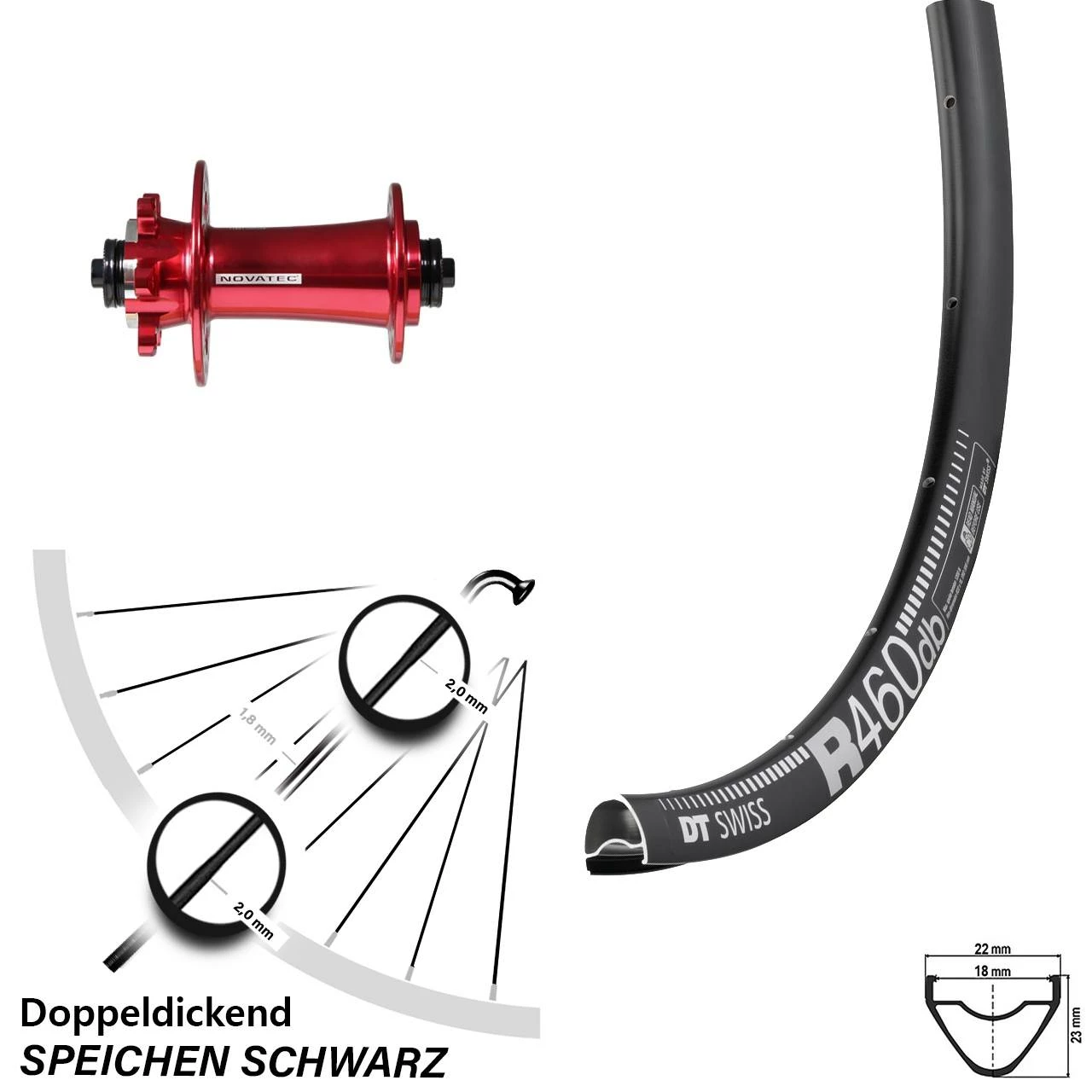 Technische Daten Vorderrad DT Swiss R 460 DB Disc schwarz mit Nabe Novatec D791SB Superlight rot