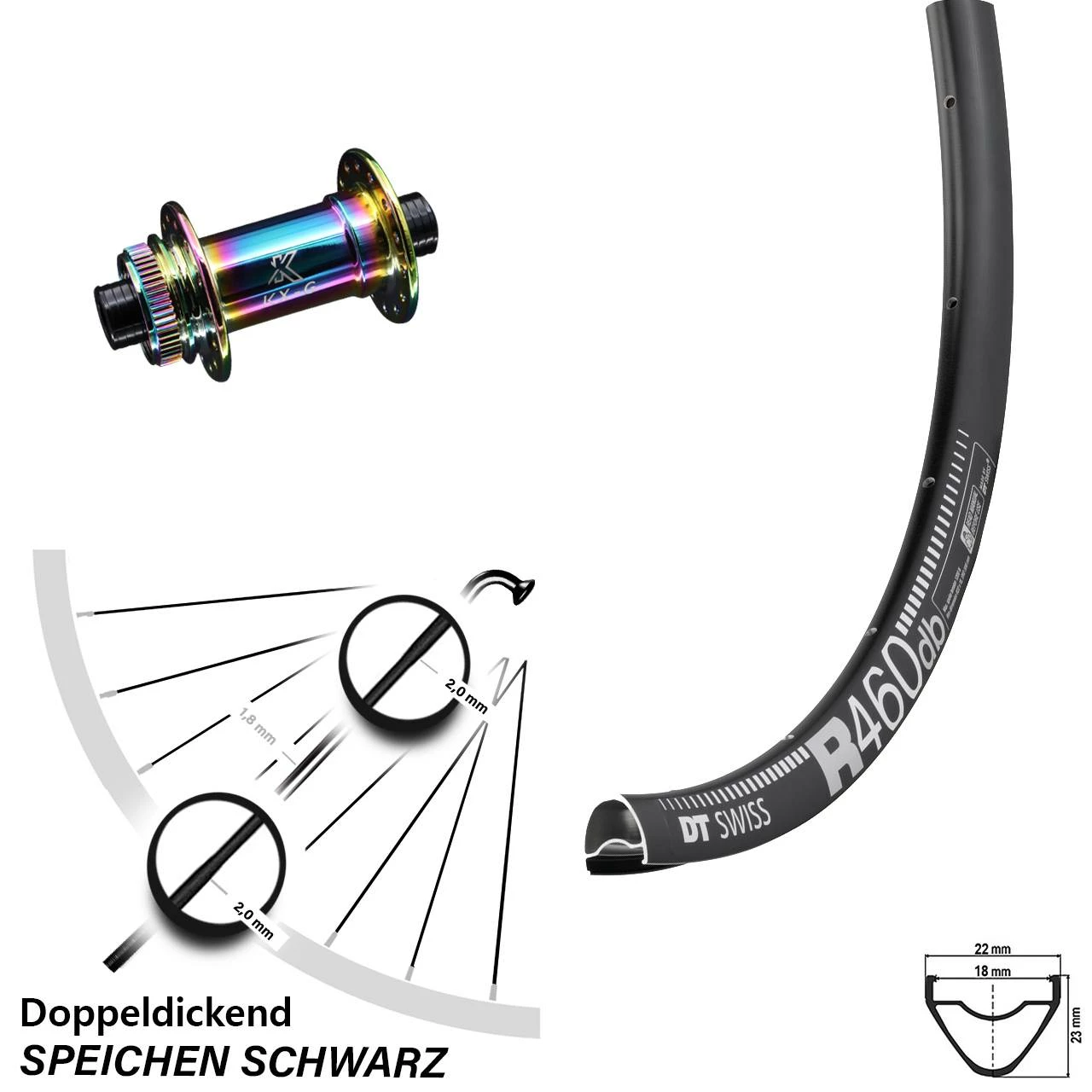 Technische Daten Vorderrad DT Swiss R 460 DB Disc schwarz mit Nabe KX-G Vorderradnabe Oilslick Centerlock 12/100