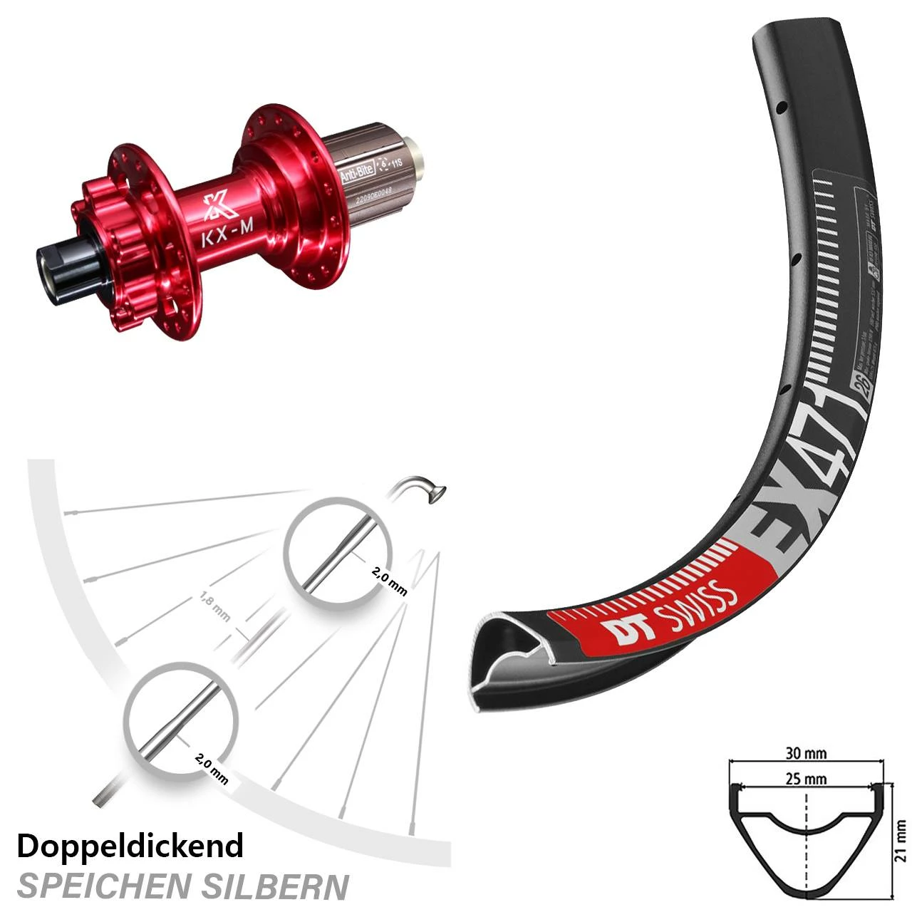 29 Zoll Hinterrad KX-M rot-eloxiert 12×142 mm 11-fach DT Swiss EX 471 mit Doppeldickendspeichen