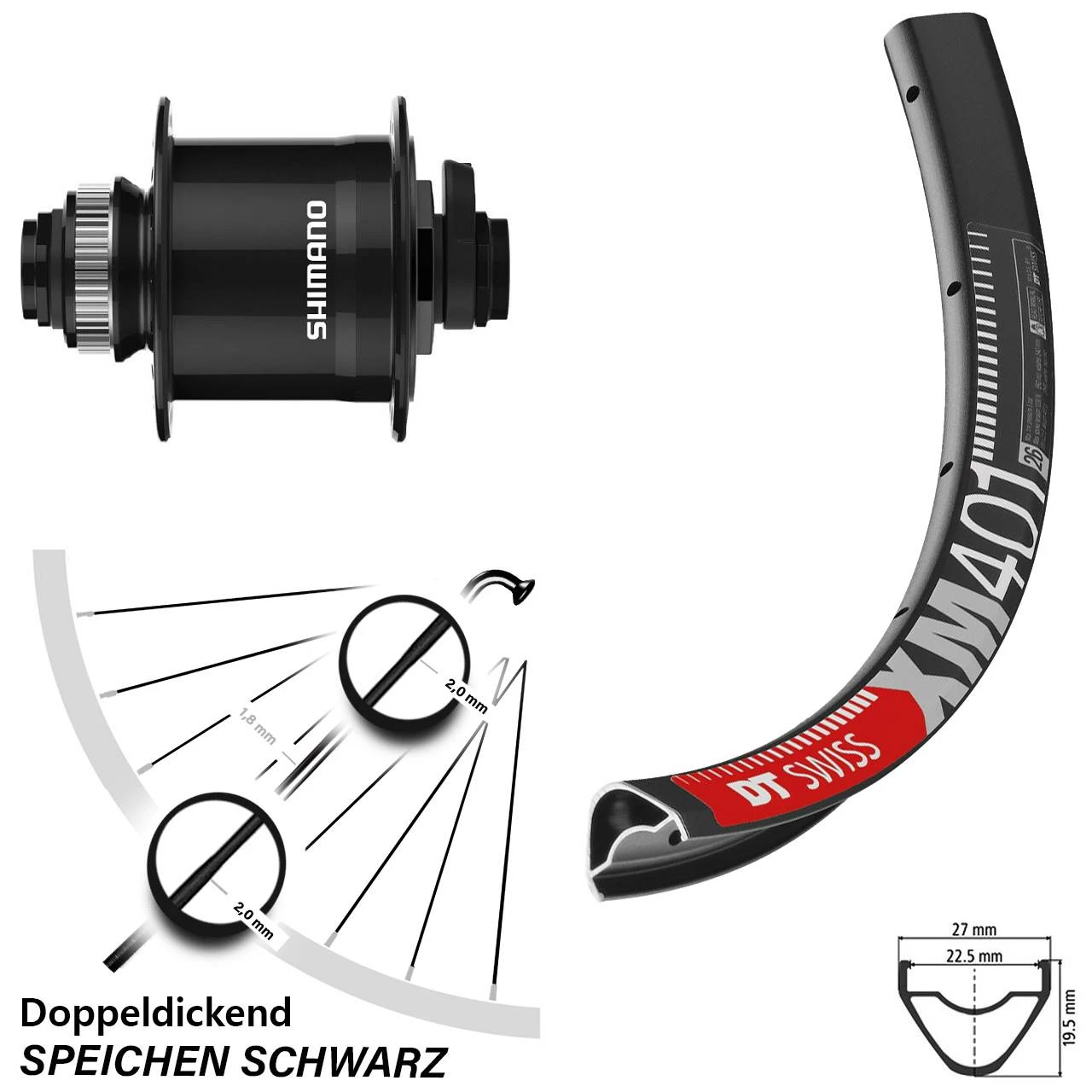 - Vorderrad 28 Zoll, 29 Zoll DT Swiss XM 401 schwarz mit Nabendynamo Shimano DH-UR708-3D schwarz