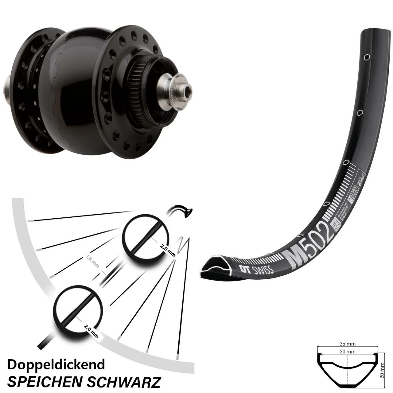 - Vorderrad 27,5 Zoll, 27,5+ Zoll DT Swiss M 502 schwarz mit Nabendynamo SON delux schwarz