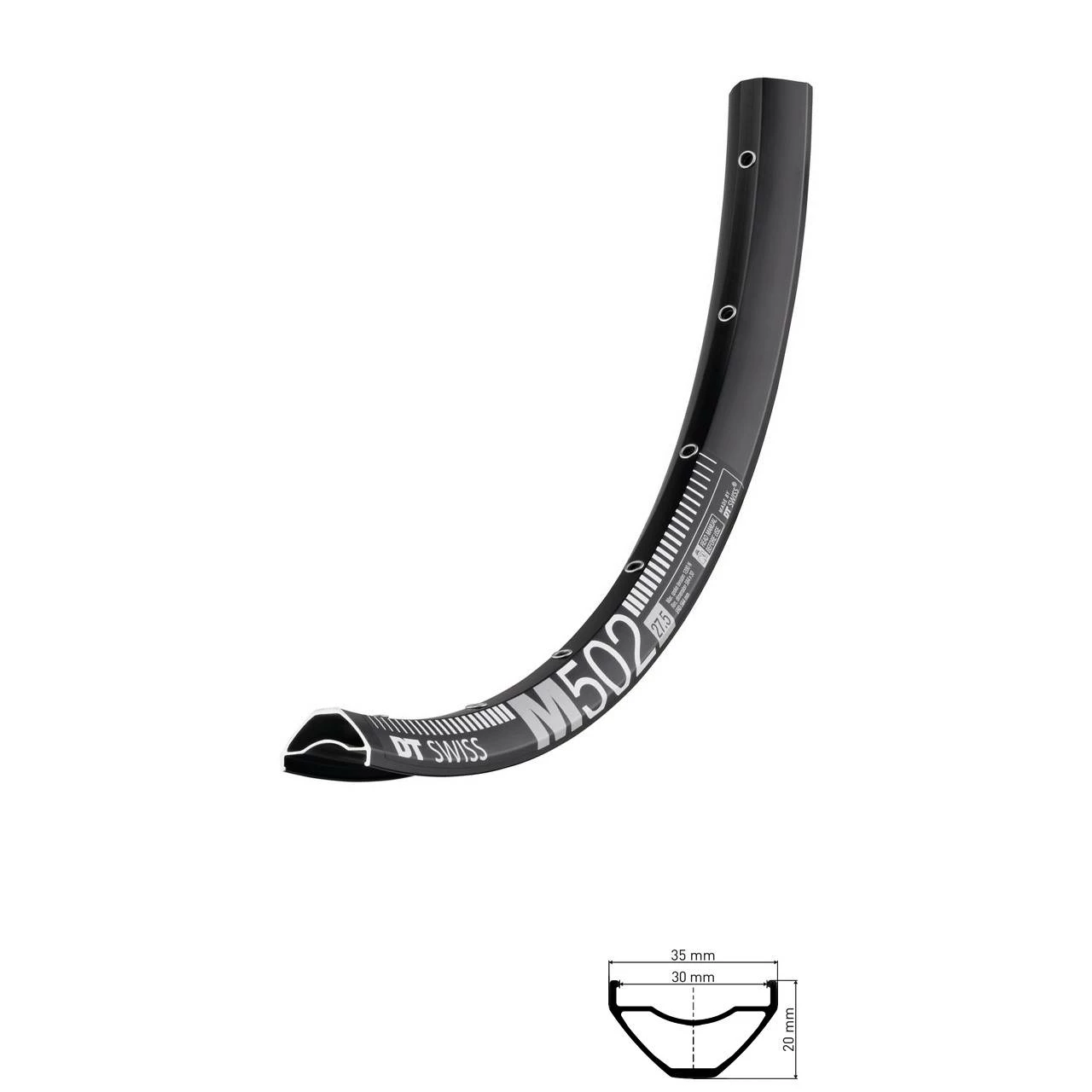 Die schwarze DT Swiss MTB-Felge M 502 DB Disc ist eine langlebige, robuste und extra stabile Hohlkammer-Felge, dank der Fertigung aus Aluminium jedoch recht leicht. Das Modell M 502 DB Disc verwendet einfach geöste Nippellöcher und weist ein breites und verstärktes Profil auf, optimal also, wenn es mal etwas rauer zugeht, z.B. abseits gut ausgebauter Straßen. Die saubere und sehr hochwertige Verarbeitung der schwarzen DT Swiss M 502 DB Disc Aluminium-Felge sorgt zudem für eine hohe Langlebigkeit. Auf der M 502 DB Disc Felge (Maulweite 30 mm, Höhe 20 mm, Breite 35 mm) können auch breite und großvolumige MTB-Reifen aufgezogen werden. Sie ist für den Einsatz am Mountainbike / MTB vorgesehen. Die DT Swiss M 502 DB Disc Felge ist für Scheibenbremsen (Disc) konzipiert. Mit bis zu 120 kg Systemgewicht ist die Felge M 502 DB Disc vom Schweizer Hersteller DT Swiss hoch belastbar und extra stabil ausgeführt. Optimal also, wenn das Bike mit schwerem Gewicht (z.B. in den Packtaschen) beladen werden soll. Diese Felge ist unter anderem auch für “Tubeless Ready (TLR)” geeignet. Sie können damit also auch spezielle Tubeless-Ready-Reifen fahren ohne einen Schlauch zu benutzen.