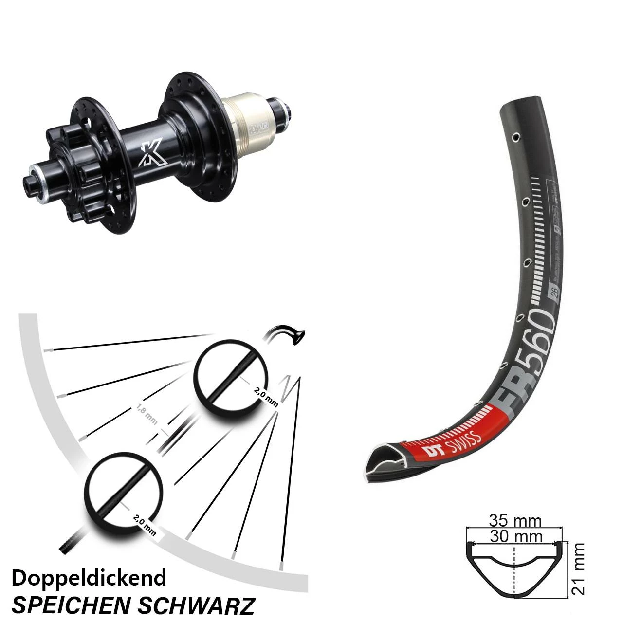Technische Daten Hinterrad DT Swiss FR 560 DB Disc schwarz und Nabe KX-M Hinterradnabe 5/135 6-Loch SRAM XD