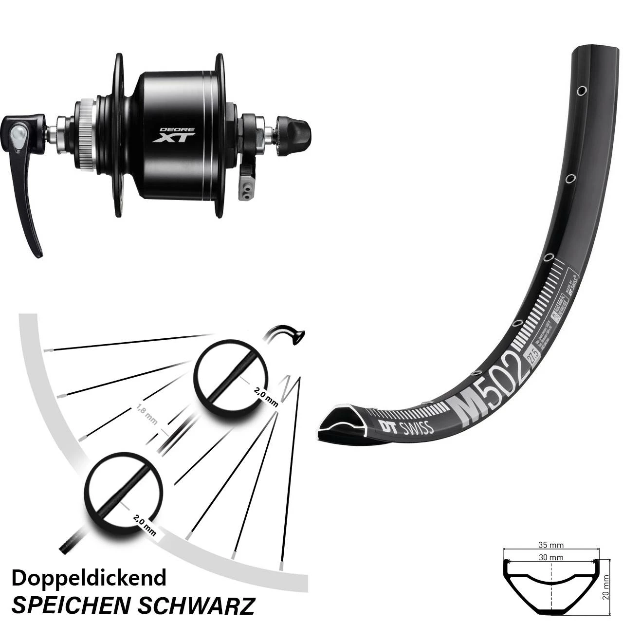Technische Daten vorderes Laufrad DT Swiss M 502 DB Disc schwarz & Nabendynamo Shimano Deore XT DH-T8000 schwarz