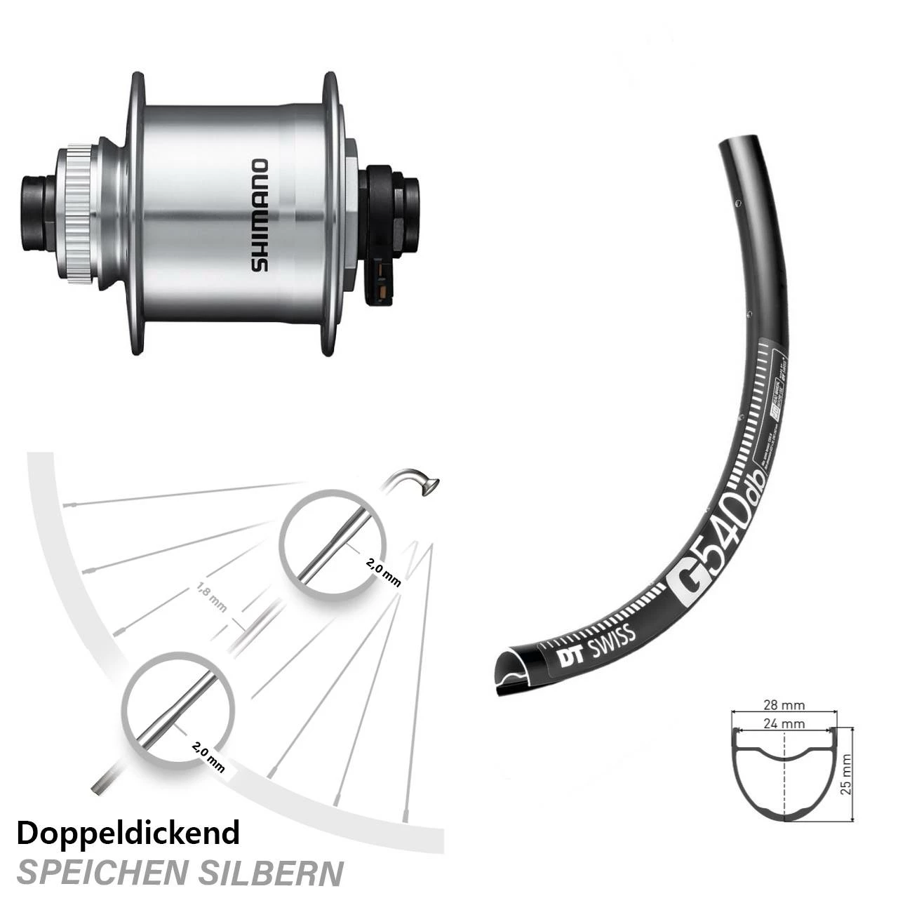 - Vorderrad 28 Zoll, 29 Zoll DT Swiss G 540 schwarz mit Nabendynamo Shimano DH-UR705-3D silbern