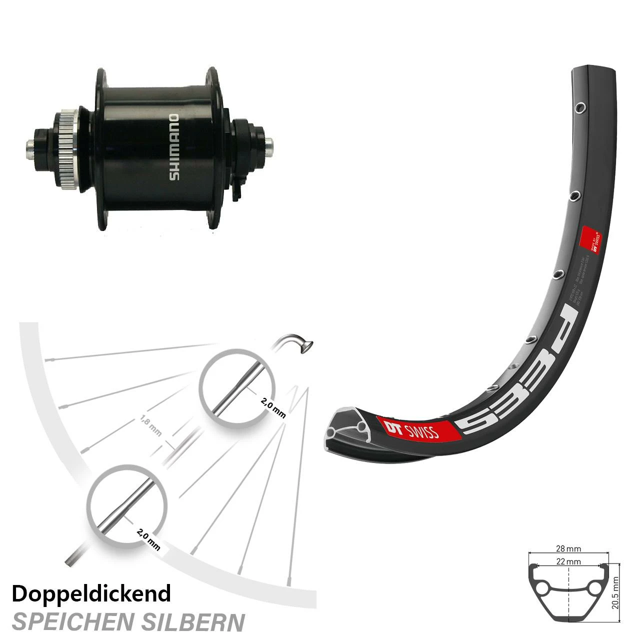 - Vorderrad 26 Zoll DT Swiss 533 D schwarz mit Nabendynamo Shimano DH-UR700 schwarz