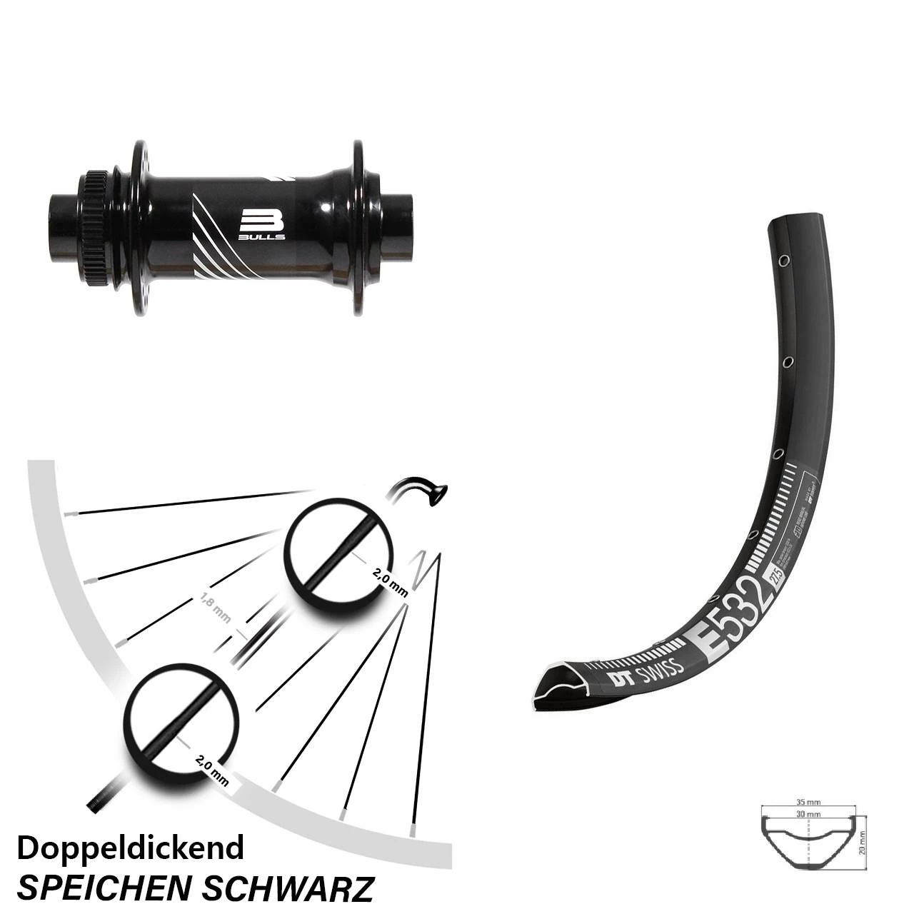 Technische Daten Vorderrad DT Swiss E 532 Disc schwarz mit Nabe Formula CL-811 Bulls Boost schwarz
