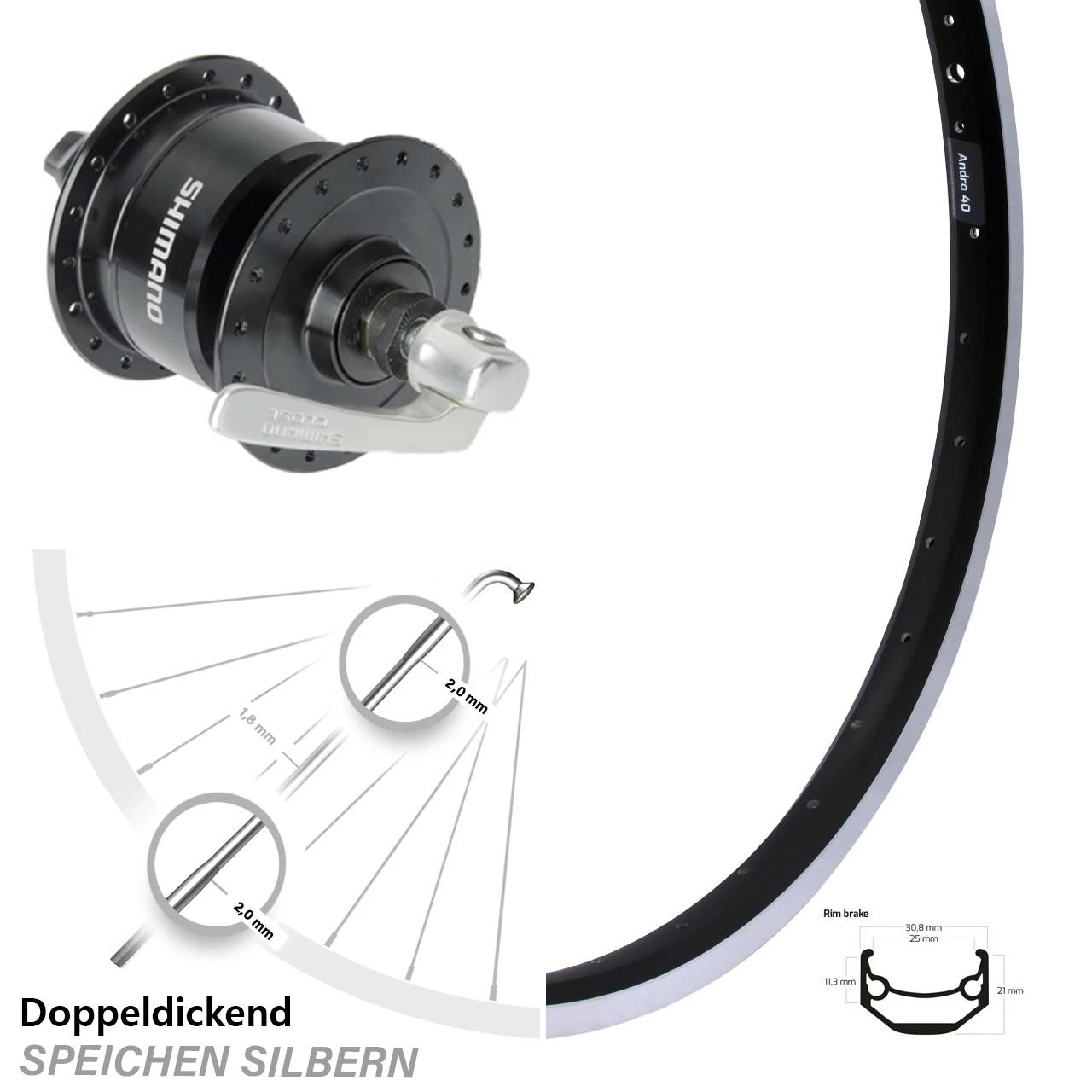 Technische Daten vorderes Laufrad Ryde Andra 40 Felgenbremse schwarz & Nabendynamo Shimano DH-3N72 schwarz