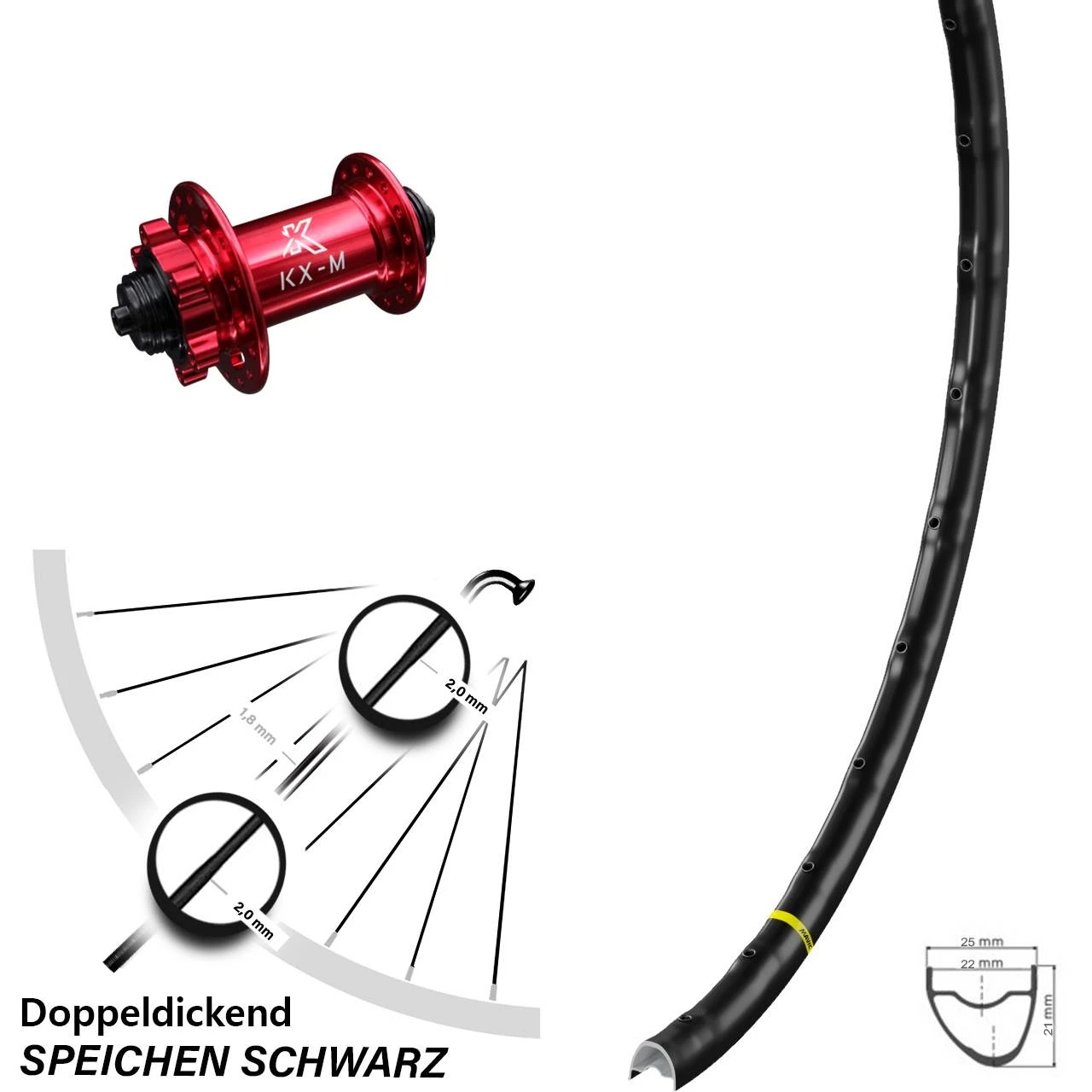 mit empfohlener Reifenbreite 25-50 mm - Nabe: KX-M Vorderradnabe Schnellspanner 5×100 mm 6-Loch rot