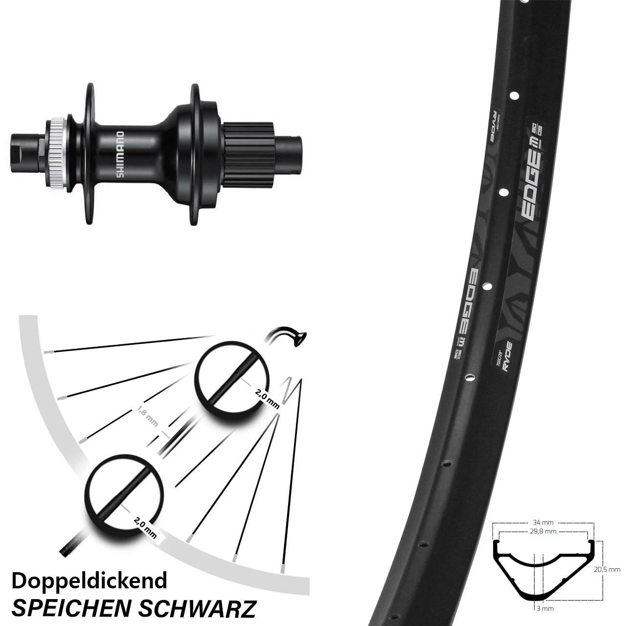 Technische Daten Hinterrad Ryde Edge M30 OS Disc schwarz und Nabe Shimano FH-MT510 schwarz