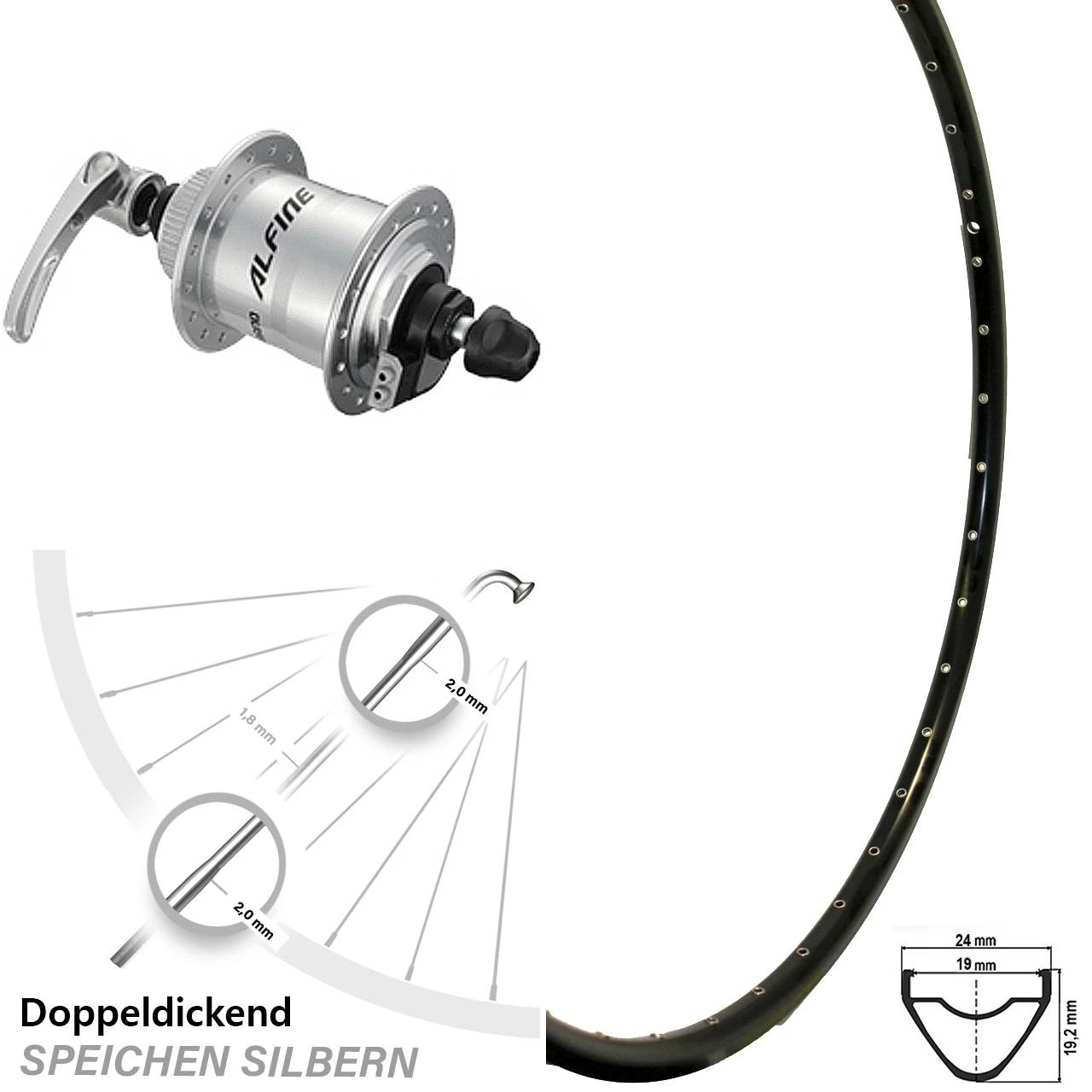 Speichen: Die Firma Sapim aus Belgien liefert mit dieser hochwertigen Edelstahl-Speiche eine gewichtsoptimierte Fahrradspeiche ab. Sie bietet sich für leichte Laufräder an und weist einen guten Mittelweg zwischen Gewicht und Stabilität auf. Diese leichte Doppeldickendspeiche ist im kritischen Bereich der Nabe und am Gewindeende mit 2,0 mm besonders stabil ausgeführt. Im Mittelteil verjüngt sie sich auf 1,8 mm, was in Summe einiges an Gewicht spart. Zudem fängt sie mit ihrer hohen Festigkeit am Mittelteil mit 1300 N/mm2 und dank ihrer guten Elastizität Bewegungen im Laufrad hervorragend auf und das ohne Einbußen bei der Seitensteifigkeit und Haltbarkeit. Der ovale Kopf, das 2-seitige Gewinde, das Anti-Rotationsteil und das selbstverriegelnde System machen die Montage recht einfach. Die endverstärkte Fahrradspeiche aus rostfreiem Edelstahl mit 2,0 mm, 1,8 mm und 2,0 mm im Durchmesser bietet sich an für die Anwendung am MTB (Mountainbike) und Rennrad.