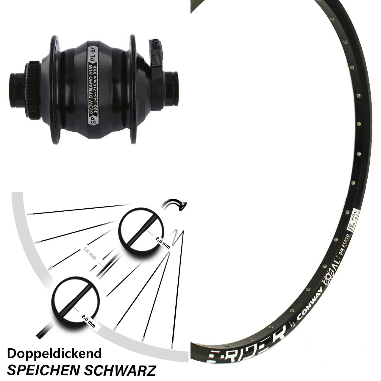 - 32 schwarze Sapim Speichen mit SpeichenstĂ€rke 2,0-1,8-2,0 mm Edelstahl – stabile und gewichtsoptimierte Doppeldickspeiche mit 1,8 mm im Mittelteil und 2,0 mm an den Endbereichen