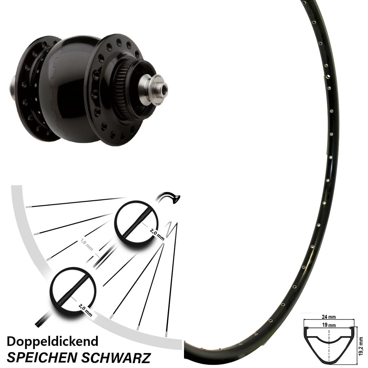 - 36 schwarze Sapim Speichen mit SpeichenstĂ€rke 2,0-1,8-2,0 mm Edelstahl – stabile und gewichtsoptimierte Doppeldickspeiche mit 1,8 mm im Mittelteil und 2,0 mm an den Endbereichen