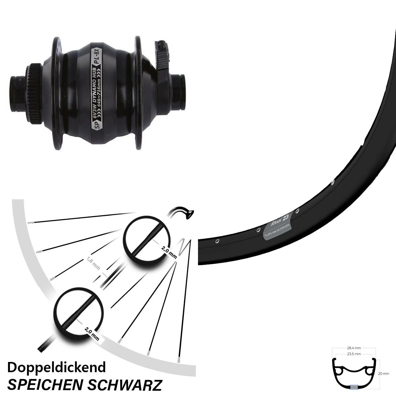 - Vorderrad 28 Zoll, 29 Zoll Ryde Rival 23 schwarz mit Nabendynamo Shutter Precision PL-8X schwarz