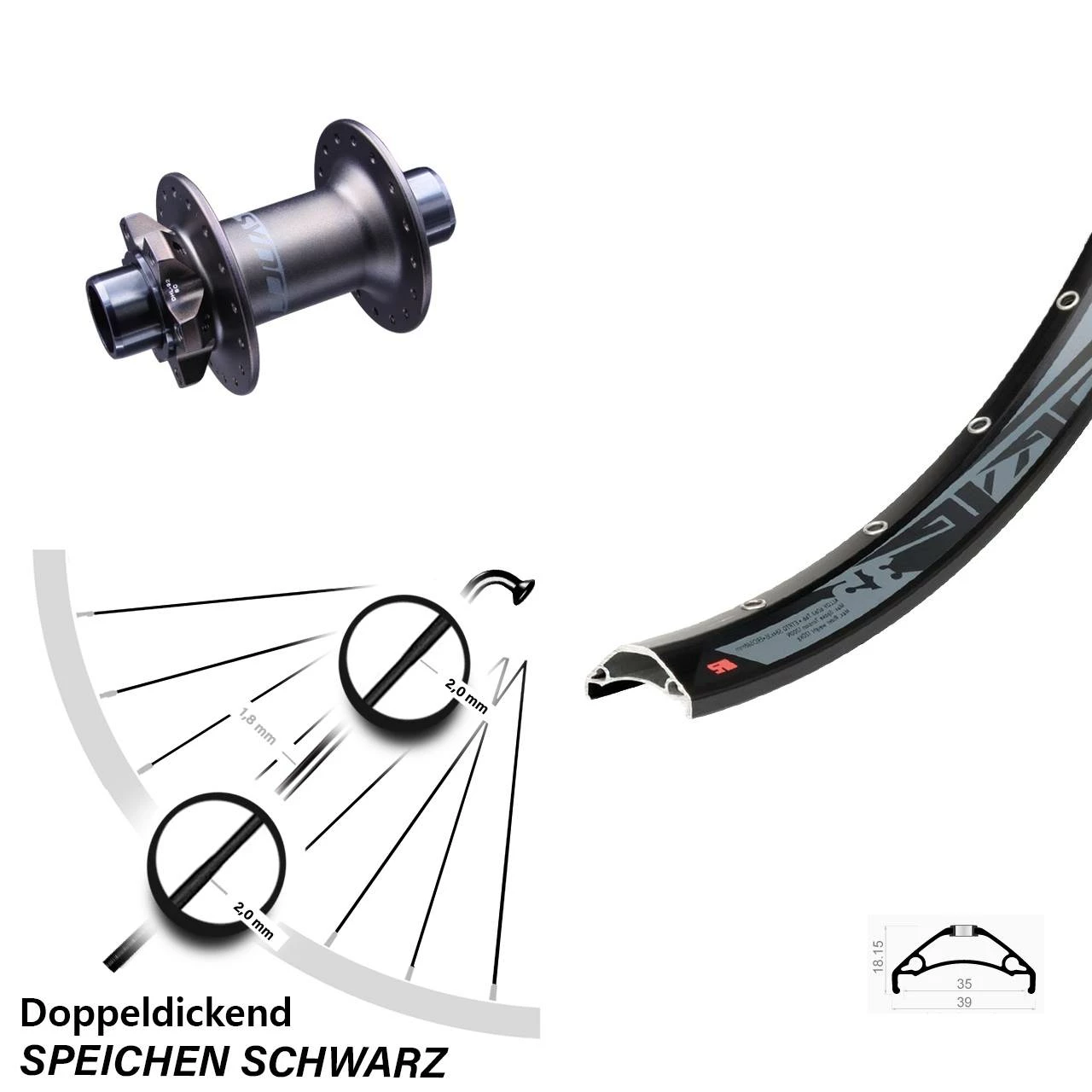 - 32 schwarze Sapim Speichen mit SpeichenstĂ€rke 2,0-1,8-2,0 mm Edelstahl – stabile und gewichtsoptimierte Doppeldickspeiche mit 1,8 mm im Mittelteil und 2,0 mm an den Endbereichen