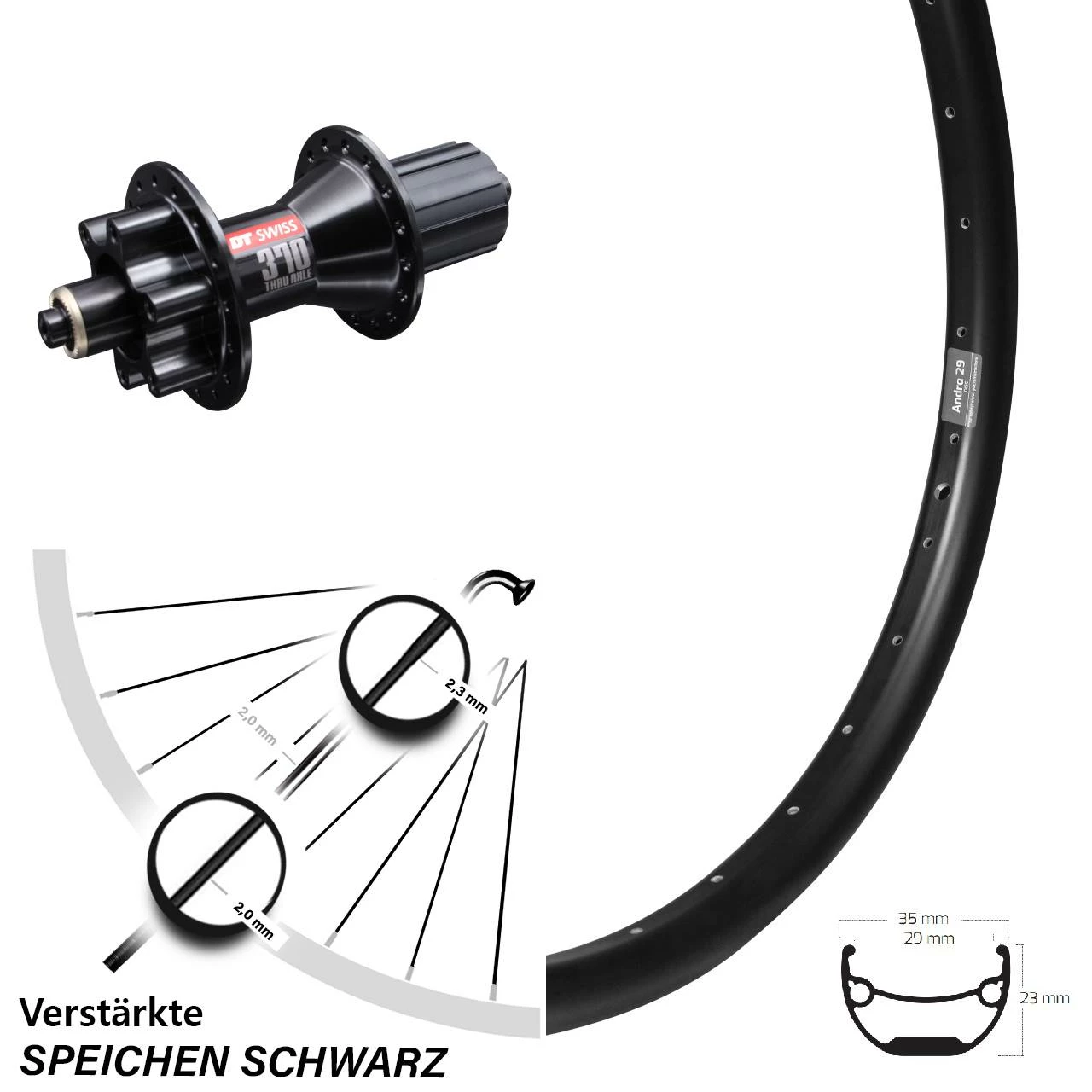 Technische Daten Hinterrad Ryde Andra 29 Disc schwarz und Nabe DT Swiss 370 Disc 6-Loch Shimano 5/135