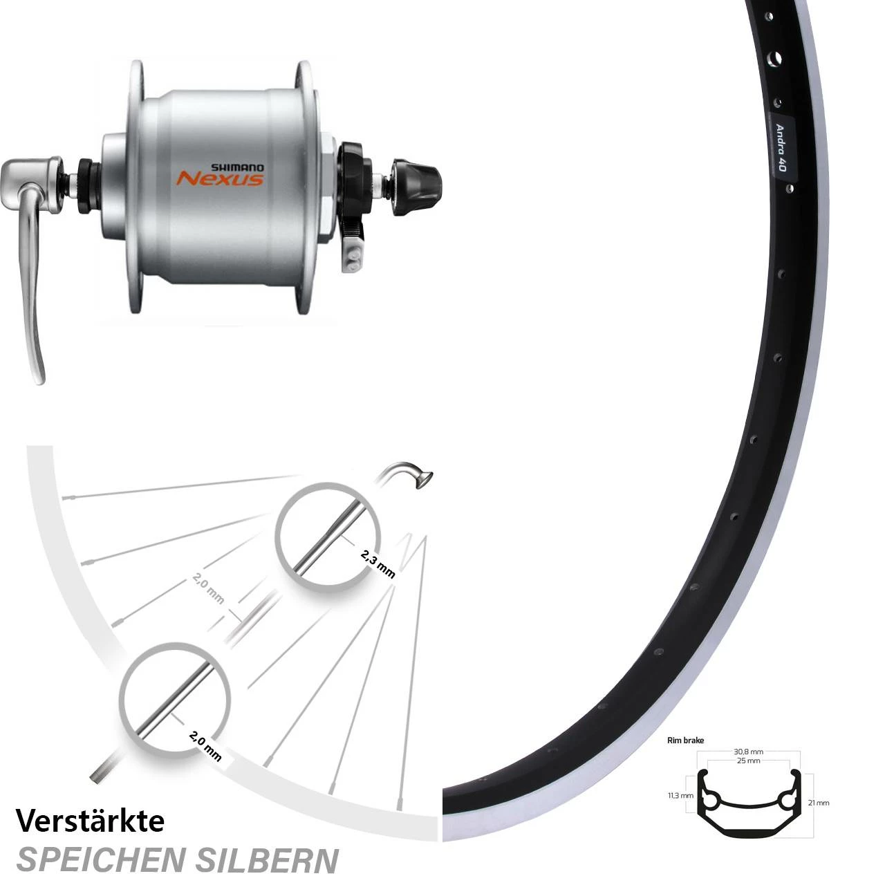 Nabendynamo: Mit dem silbernen Nexus DH-C3000-3N-QR hat der japanische Markenhersteller Shimano einen preiswerten und einfachen Nabendynamo direkt in die Vorderradnabe eingebaut. Von hier aus versorgt er die Beleuchtung an LastenrĂ€dern, City- oder Trekkingbikes ĂŒber 3 Watt Leistung mit genug Strom, um Sie auch bei witterungsbedingt schlechten SichverhĂ€ltnissen, wie zum Beispiel im Nebel rechtzeitig fĂŒr weitere Verkehrsteilnehmer wahrnehmbar zu machen. Das Bauteil aus der Nexus C3000 Serie verfĂŒgt ĂŒber 100 mm Einbaubreite und mm Nabenflanschabstand. Er ist zudem mit einer Einzelkontaktdichtung ausgestattet. Passend sind RĂ€der von 16 bis 28 Zoll GröĂe mit einer Felgenbremse. Hier wird er leicht ĂŒber einen 5 mm Schnellspanner befestigt.