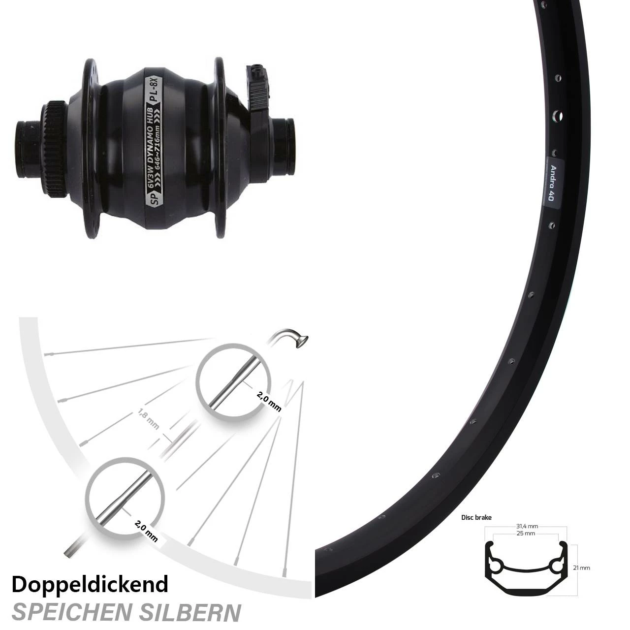 - Vorderrad 28 Zoll, 29 Zoll Ryde Andra 40 Disc schwarz mit Nabendynamo Shutter Precision PL-8X schwarz