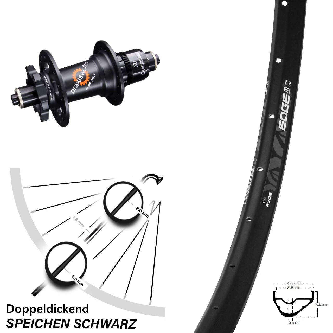 Technische Daten Hinterrad Ryde Edge M22 OS Disc schwarz und Nabe DT Swiss 350 SL Disc 6-Loch SRAM XD 5/135