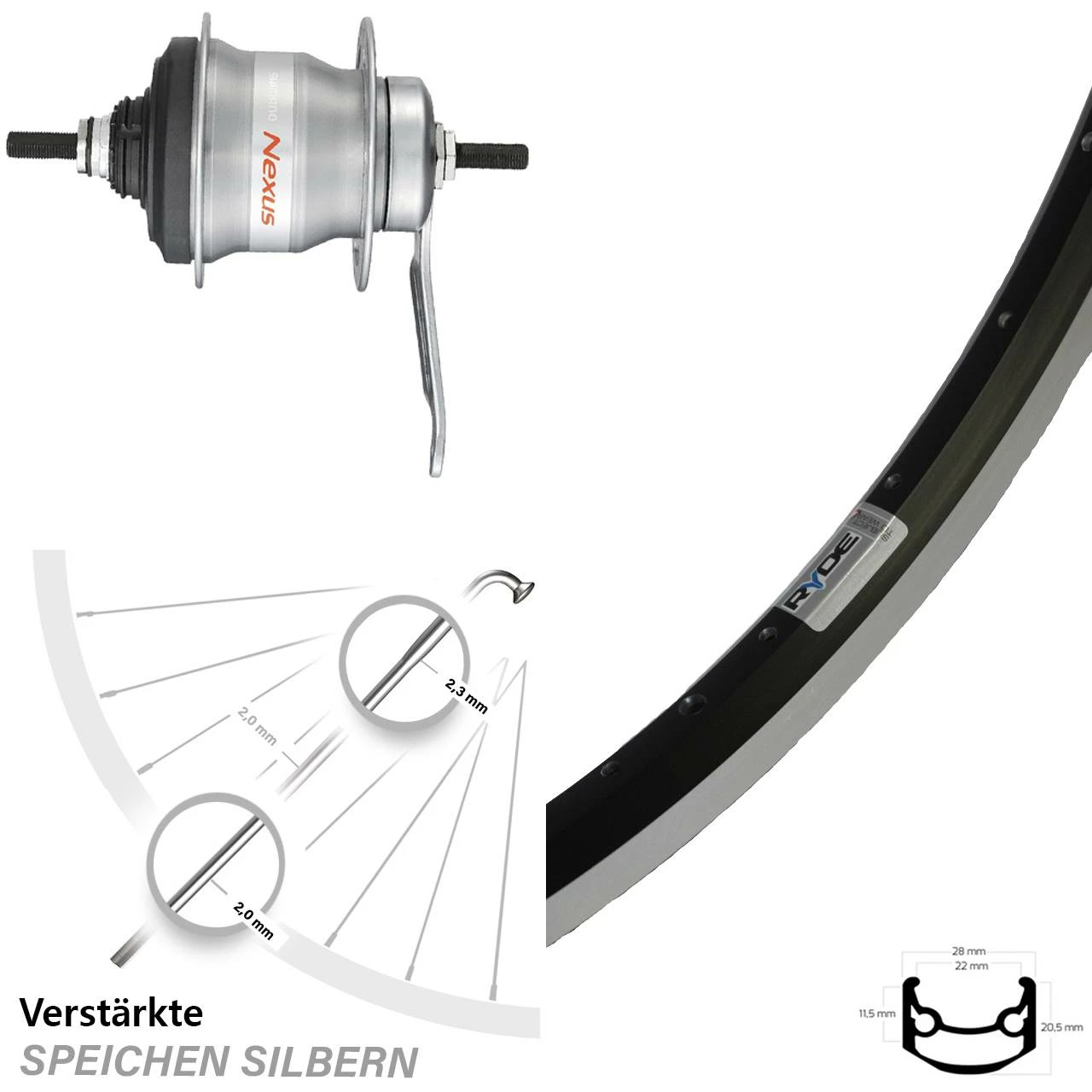 Technische Daten Hinterrad Ryde Andra 35 Felgenbremse schwarz und Nabe Shimano Nexus 7-Gang SG-7C30 silbern