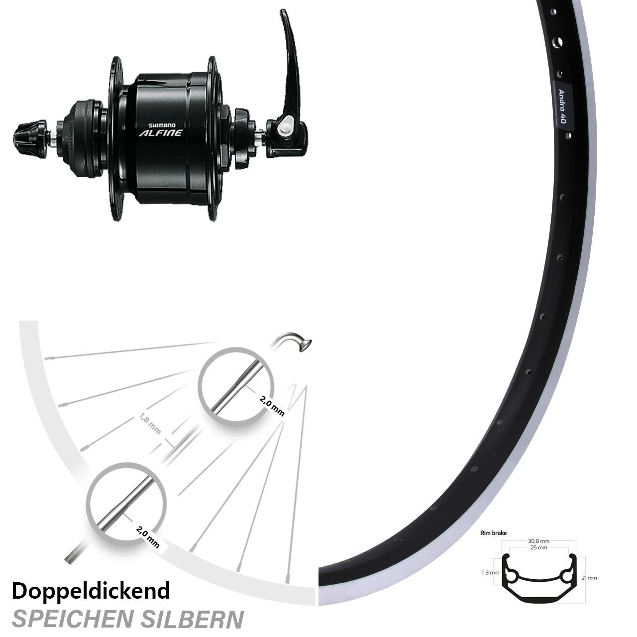 - Vorderrad 28 Zoll, 29 Zoll Ryde Andra 40 schwarz mit Nabendynamo Shimano Alfine DH-S501 schwarz