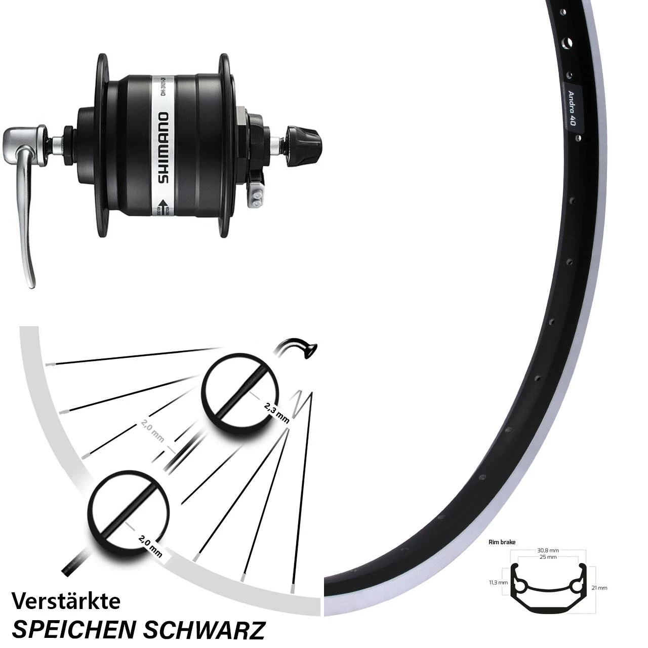 Technische Daten vorderes Laufrad Ryde Andra 40 Felgenbremse schwarz & Nabendynamo Shimano DH-3N31-QR schwarz