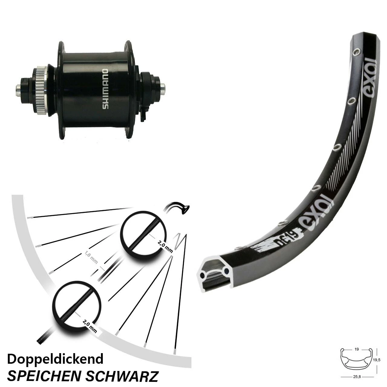 Technische Daten vorderes Laufrad Exal DC 19 schwarz & Nabendynamo Shimano DH-UR700-3D schwarz