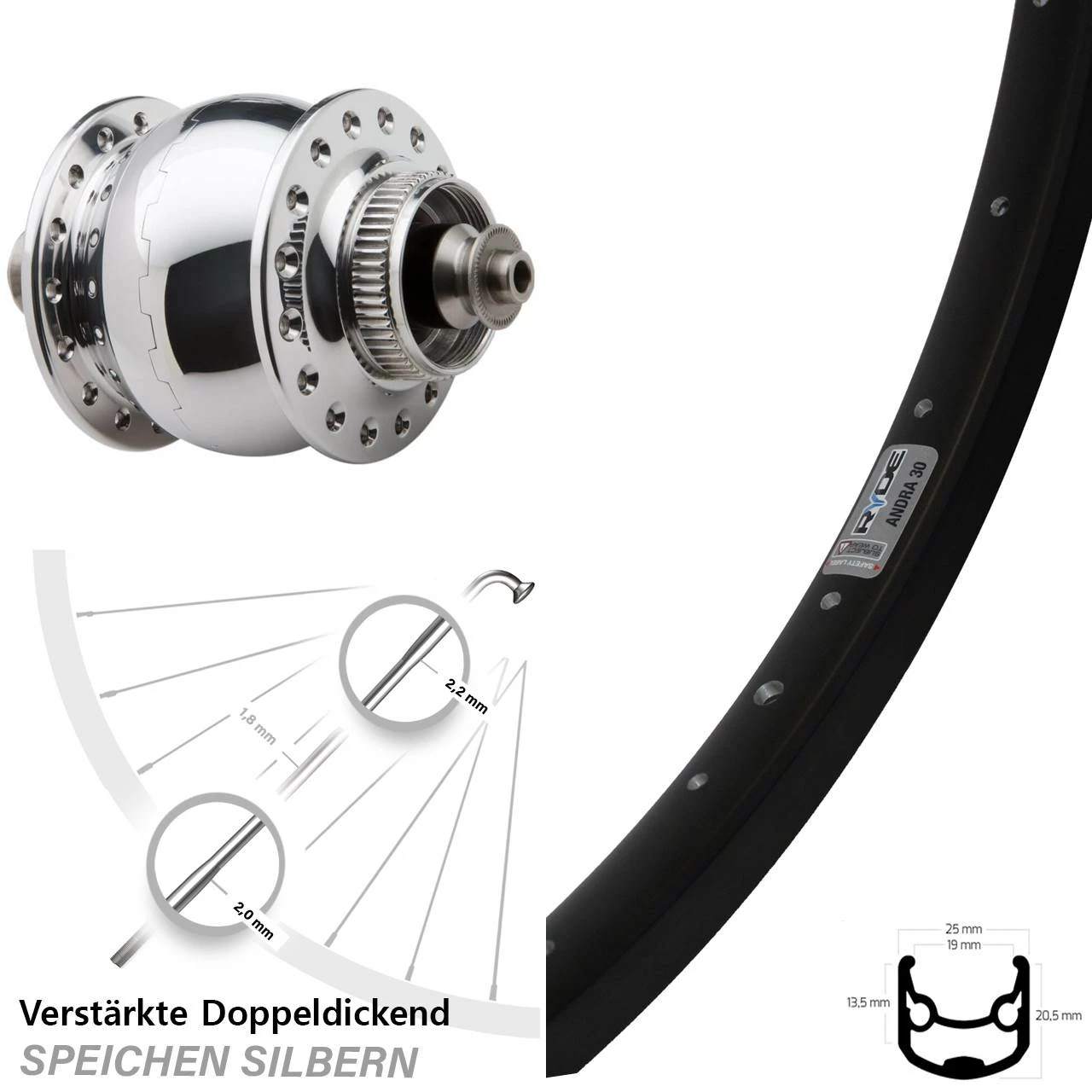 - Vorderrad 28 Zoll, 29 Zoll Ryde Andra 30 Disc schwarz mit Nabendynamo SON 28 Disc Centerlock silbern