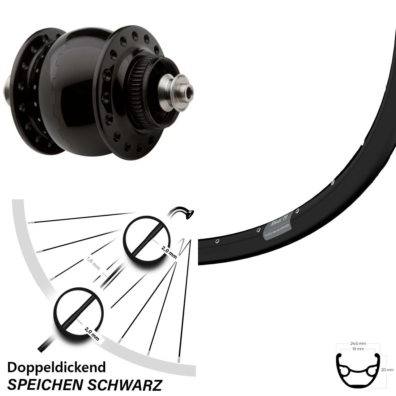 Technische Daten Vorderrad Ryde Rival 19 Disc schwarz & Nabendynamo SON delux Disc Centerlock Hohlachse schwarz eloxiert
