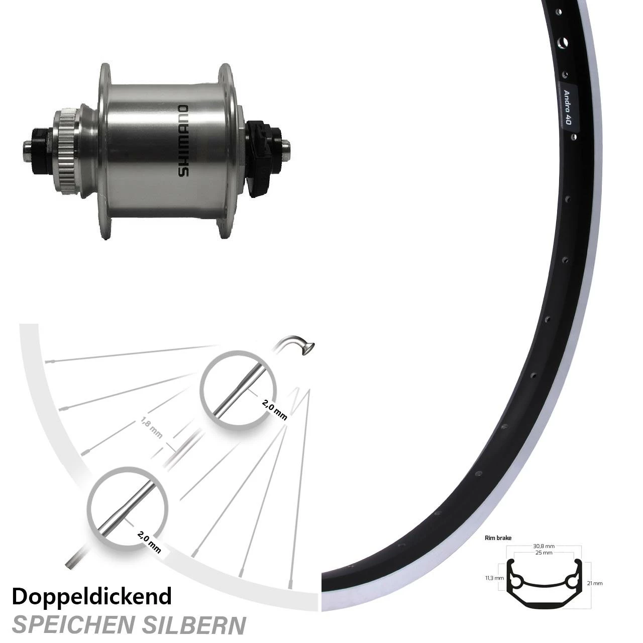 - Vorderrad 28 Zoll, 29 Zoll Ryde Andra 40 schwarz mit Nabendynamo Shimano DH-UR700-3D silbern