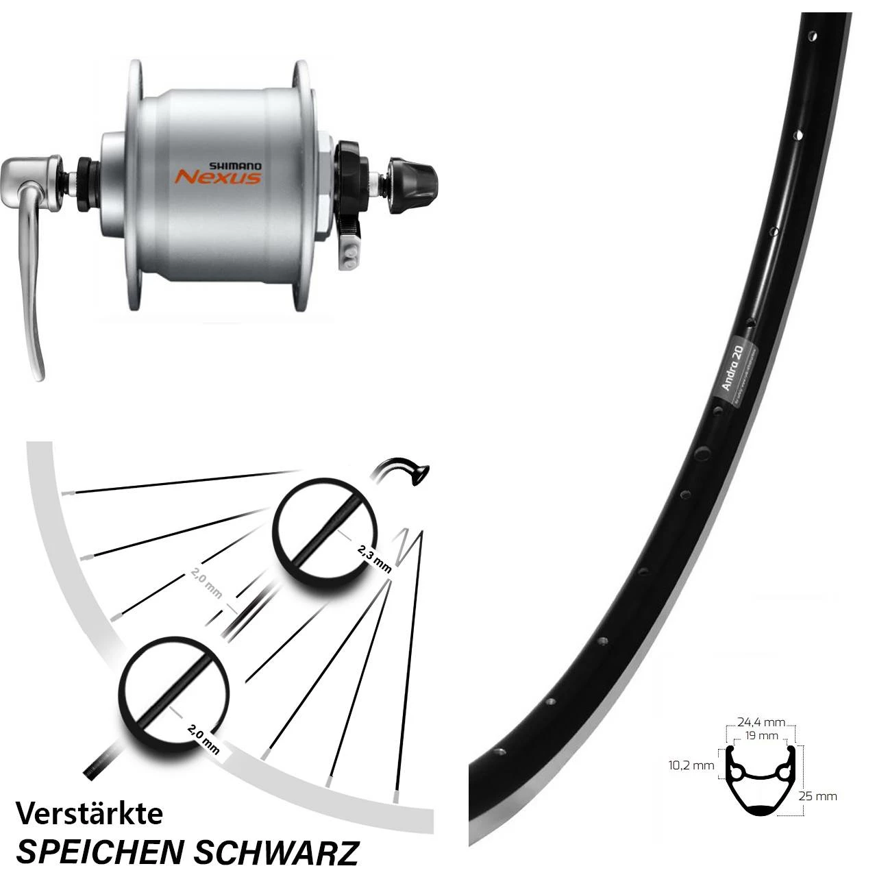 - Vorderrad 28 Zoll Ryde Andra 20 schwarz mit Nabendynamo Shimano Nexus DH-C3000-3N silbern
