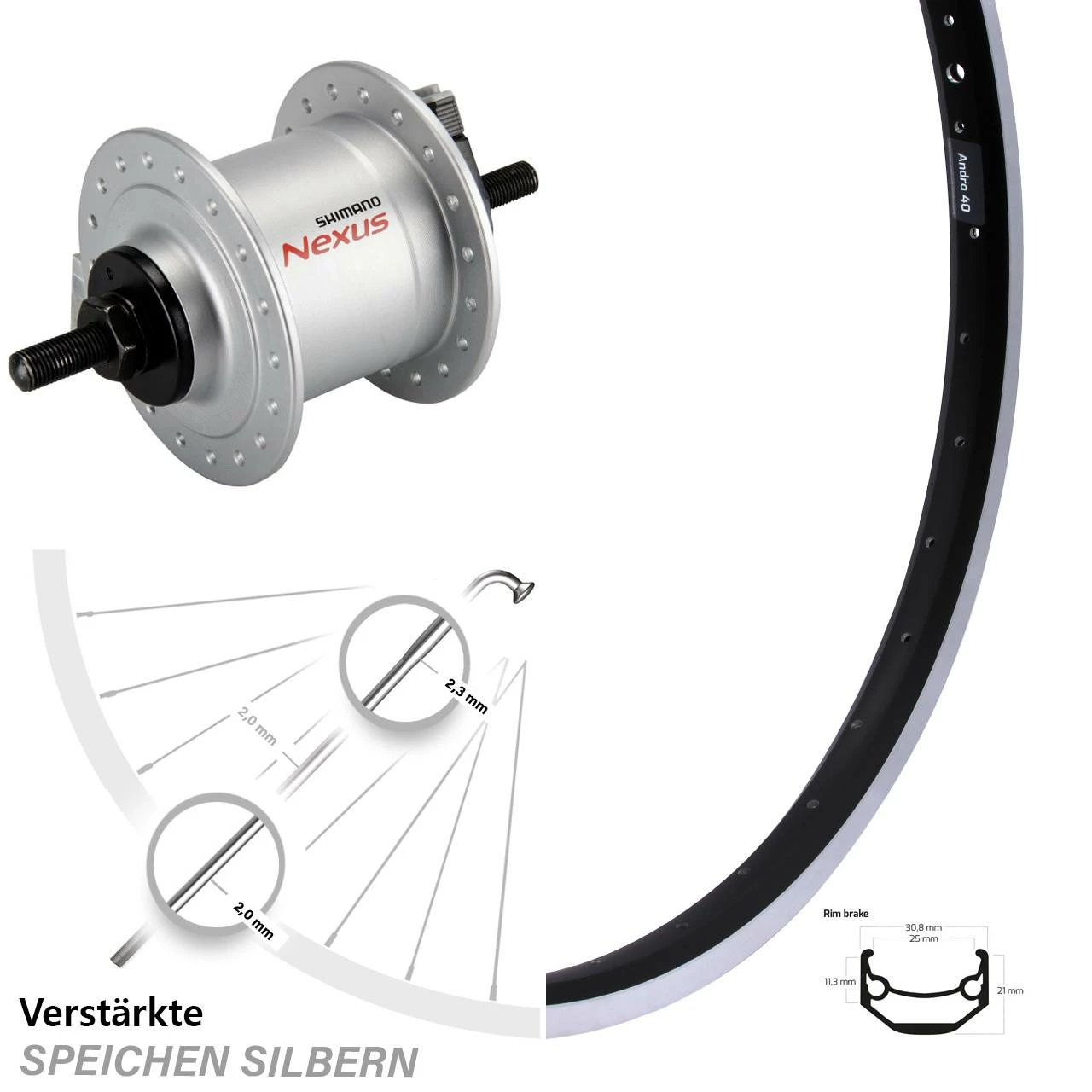 Technische Daten vorderes Laufrad Ryde Andra 40 Felgenbremse schwarz & Nabendynamo Shimano DH-C3000-1N silbern Mutterntyp