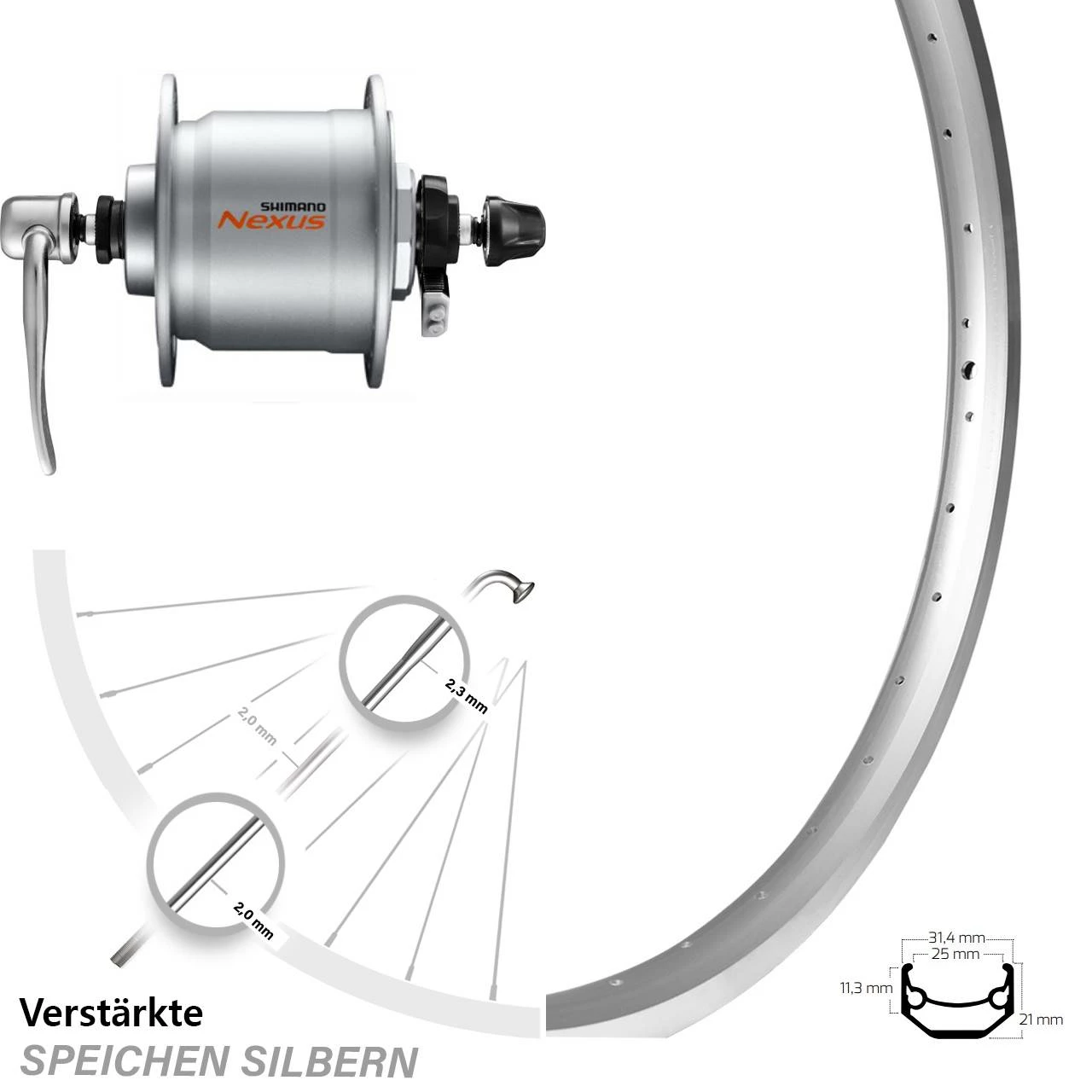 Technische Daten vorderes Laufrad Ryde Andra 40 silbern & Nabendynamo Shimano DH-C3000-3N-QR silbern