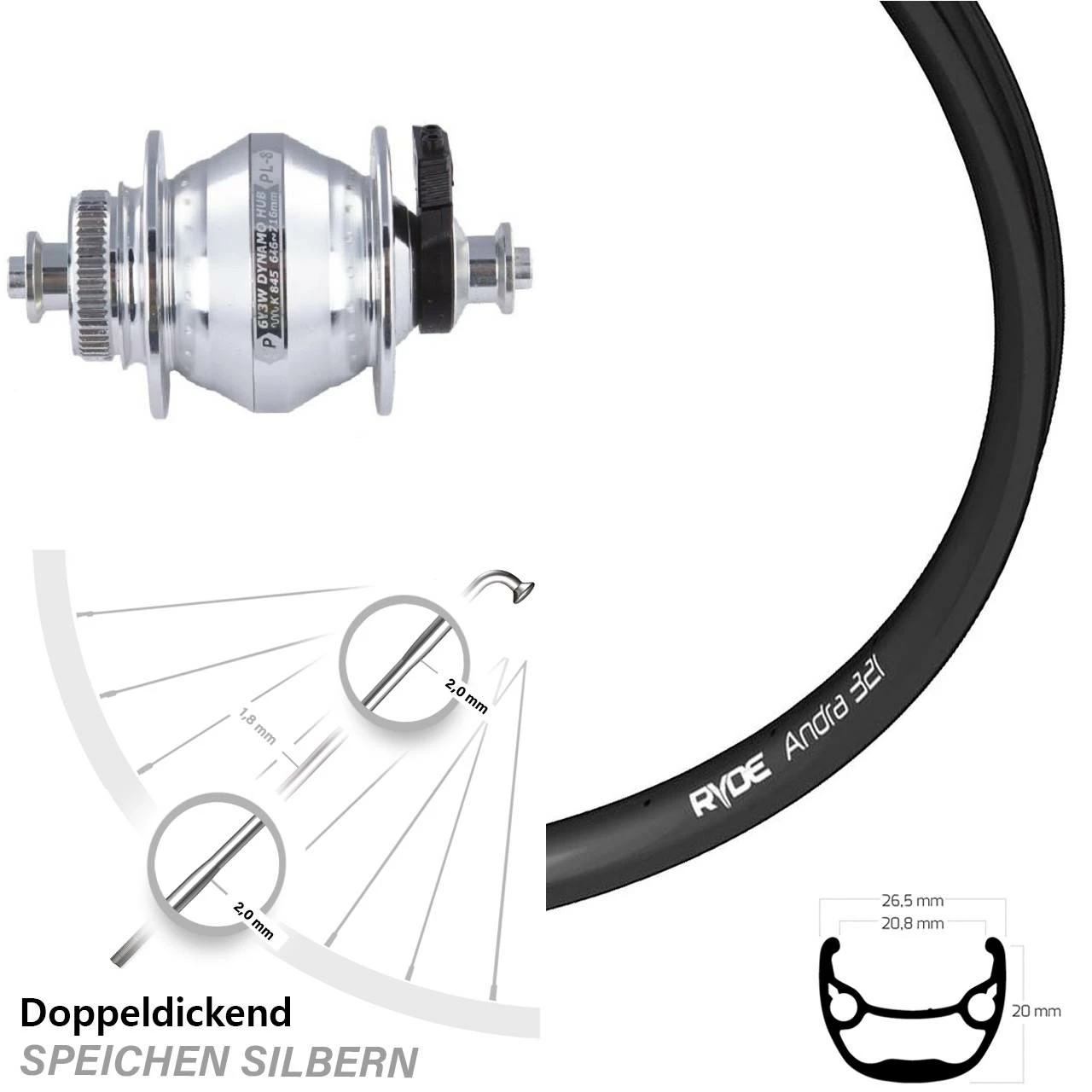 - Vorderrad 28 Zoll, 29 Zoll Ryde Andra 321 schwarz mit Nabendynamo Shutter Precision PL-8 silbern